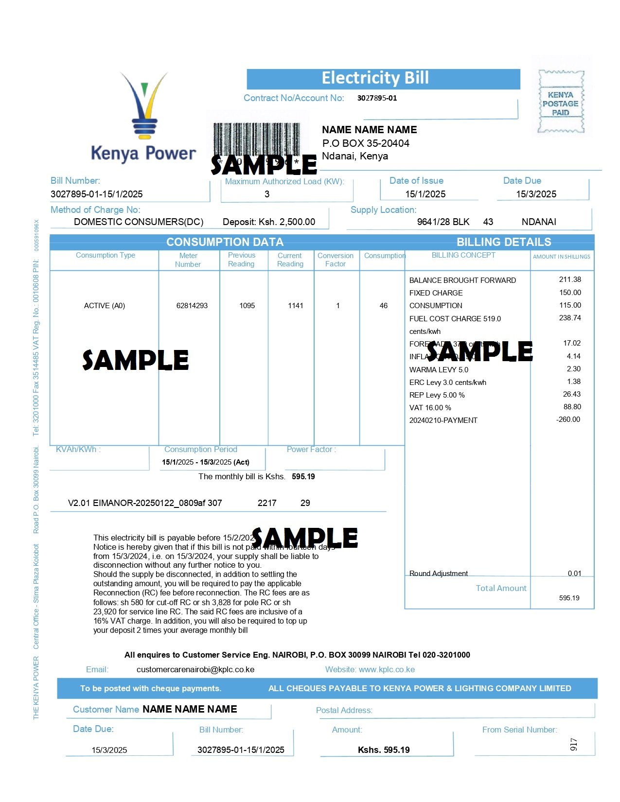 Fully editable Kenyan KPLC Utility Bill in ms. word format.