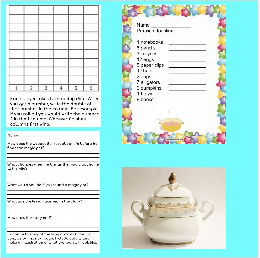 This unit is based on the story, The Magic Pot, a Chinese folktale. It includes a video read-aloud, comprehension and writing activities. It also includes math activities on doubling.