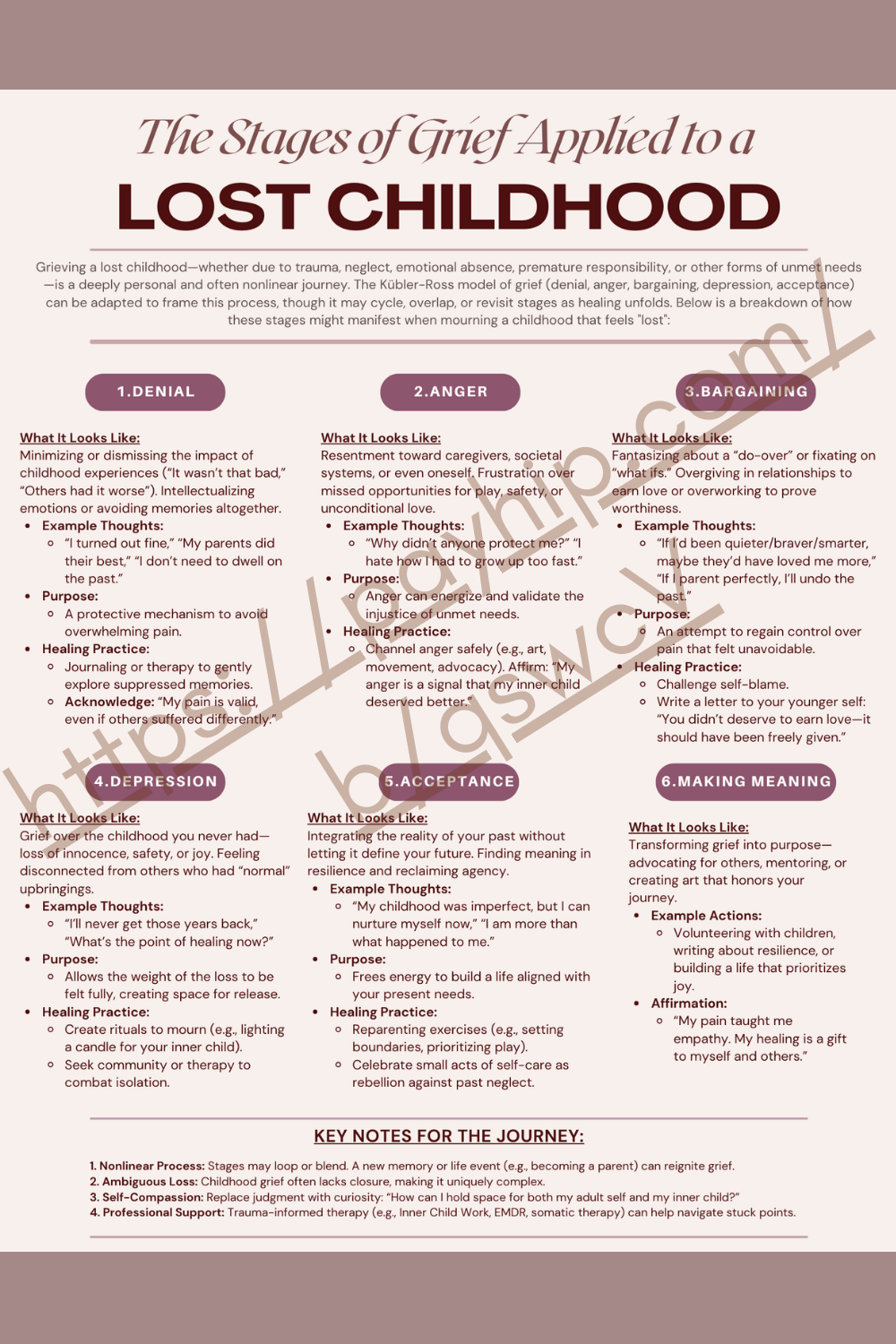 Grieving a lost childhood—whether due to trauma, neglect, emotional absence, premature responsibility, or other forms of unmet needs—is a deeply personal and often nonlinear journey. The Kübler-Ross model of grief (denial, anger, bargaining, depression, acceptance) can be adapted to frame this process, though it may cycle, overlap, or revisit stages as healing unfolds. This worksheet offers a breakdown of how these stages might manifest when mourning a childhood that feels "lost".