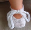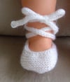 These 3ply baby ballet shoes are knitted in garter stitch with an i-cord ankle tie. They can be worn with the cord wrapped once and tied in a large bow, or wrapped around the ankle and leg then tied like traditional ballet slippers. This style of shoe is also available in 4ply and 8ply.