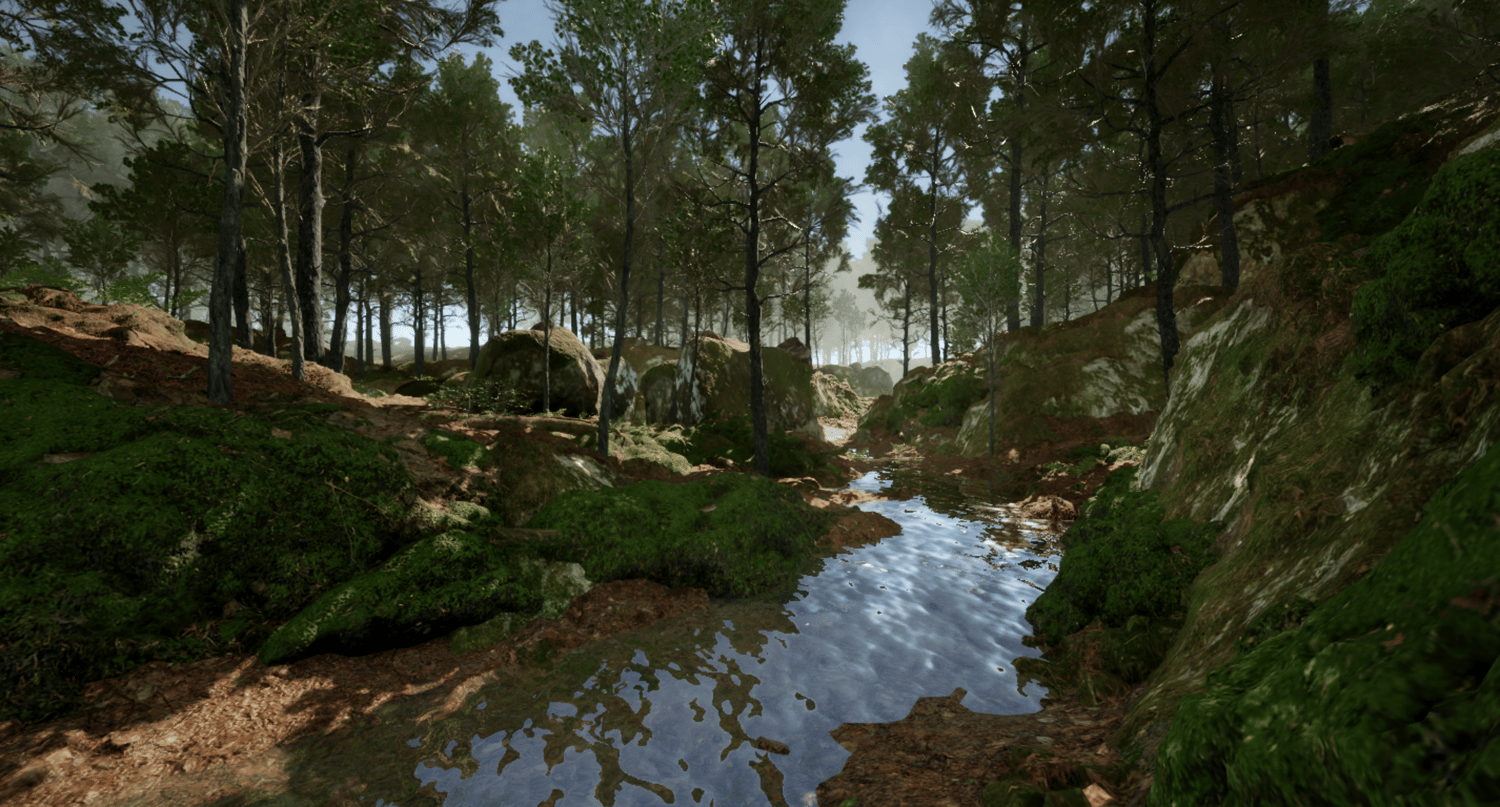 An immersive natural environment featuring dense trees, flowing streams, and detailed vegetation. The forest captures lifelike textures and lighting, creating a serene yet dynamic atmosphere. Ideal for open-world exploration, survival games, or scenic backdrops.