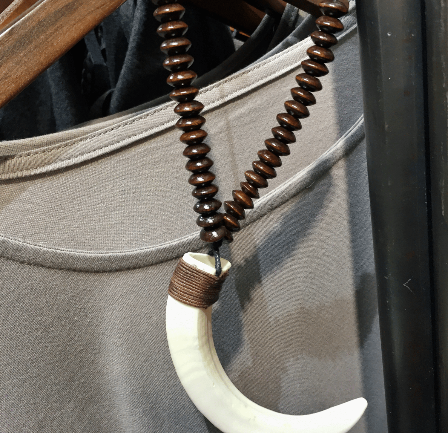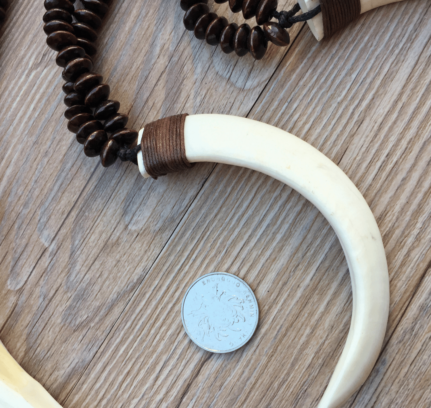 Handmade ethnic boho wood bead wild boar tusk long necklace