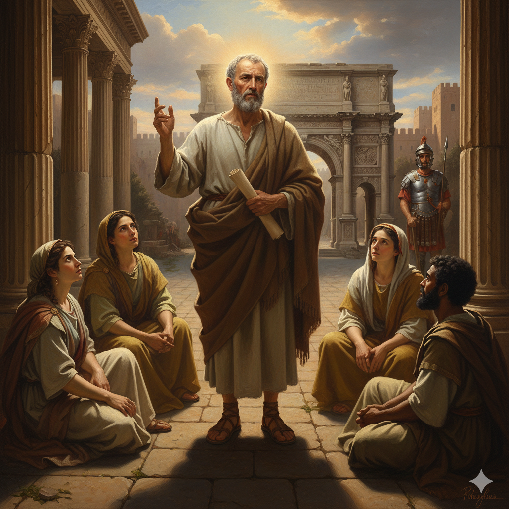 A historical biblical scene of the Apostle Paul in the 1st century, standing in a stone courtyard of ancient Rome, wearing a simple linen robe and cloak, his face weathered yet peaceful, holding a parchment scroll as he teaches a small group of believers. Soft golden sunlight breaks through the clouds, illuminating Paul with a subtle heavenly glow. Roman architecture surrounds the scene—arches, columns, and distant city walls—while a Roman guard watches quietly in the background. The atmosphere is reverent and inspiring, symbolizing faith, perseverance, and the spread of the Gospel. Highly detailed, realistic painting style, dramatic lighting, warm earth tones, cinematic composition, ultra-high resolution, historically accurate details.