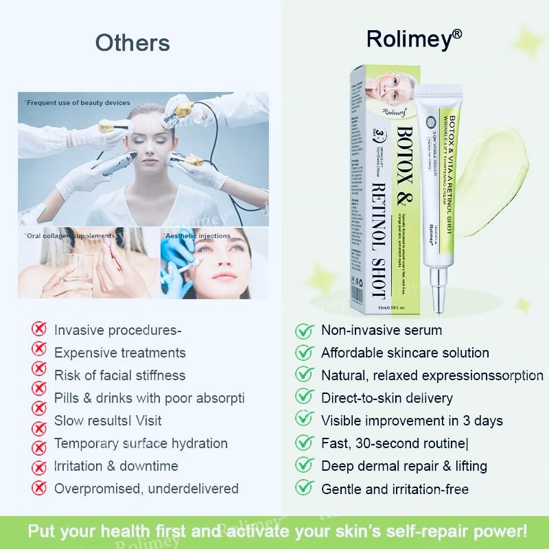 Top Australia dermatologists consider Rolimey® Botox & Vita-A Retinol Shot a breakthrough in at-home anti-aging skincare. Clinically supported and recognized by leading dermatology associations, regular use has been shown to reduce wrinkles, improve skin firmness, and stimulate collagen production. Experts agree it’s a safe, non-invasive alternative to costly professional treatments, allowing anyone to enjoy professional-level anti-aging results at home.
