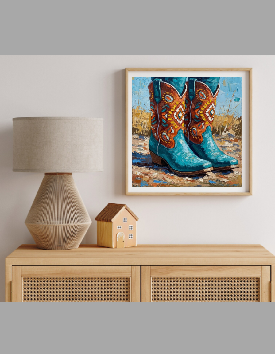 Elevate your space with this stunning cowboy boots wall art PNG digital download, featuring vibrant turquoise boots adorned with intricate orange, yellow, and diamond patterns against a scenic prairie backdrop. Perfect for western wall decor enthusiasts, this high-resolution 300 DPI file is ideal for printing as a printable poster, canvas, or framed art piece in your home, office, or ranch-style room.