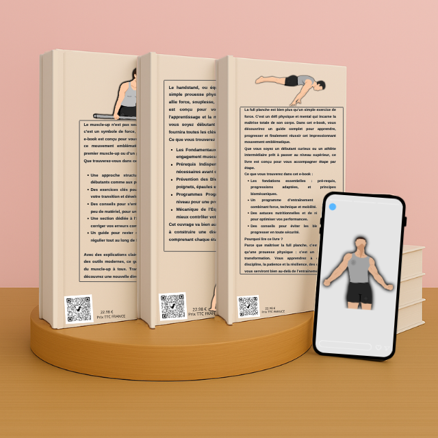 Dreaming of mastering the most iconic moves in street workout? This pack includes three comprehensive e-books to guide you step by step through the Full Planche, Handstand, and Muscle-Up. Designed for all levels, these guides offer the keys to progressing effectively, avoiding injuries, and developing impressive functional strength.