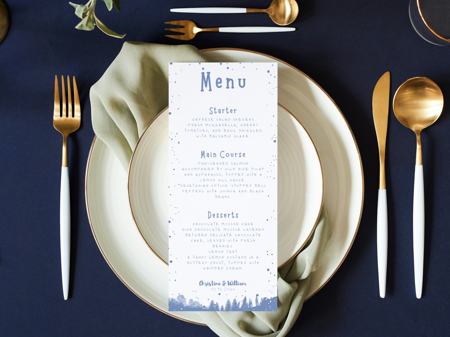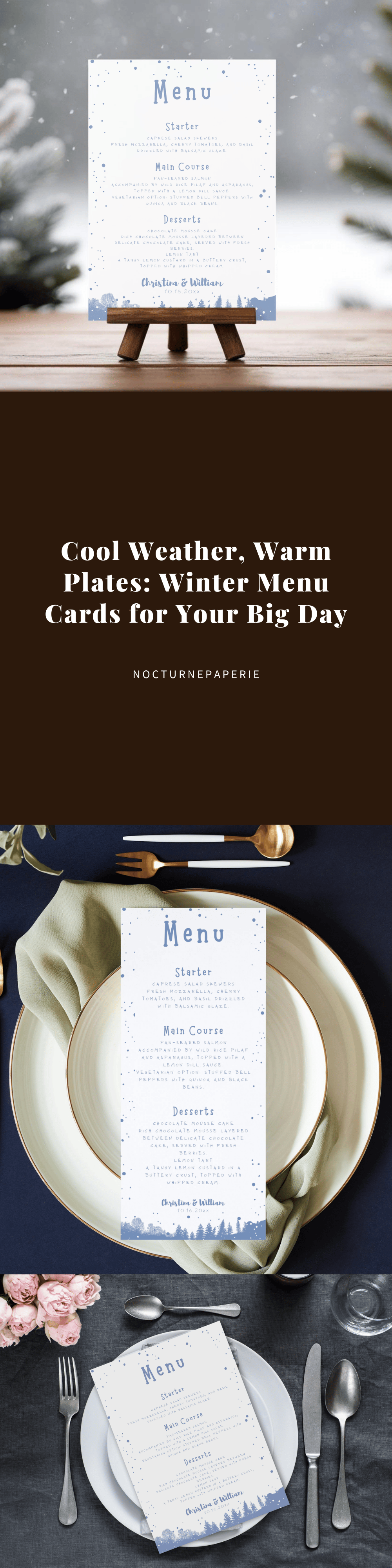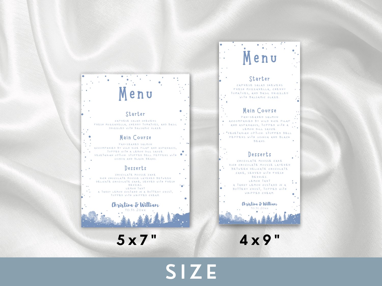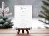 Add a frosty elegance to your reception with this winter wedding menu template featuring a blue-themed design. This editable Canva printable is perfect for wedding banquets, dinner displays, or reception meal signage. It’s part of our seasonal collection on NocturnePaperie—explore other seasons like Autumn, Spring, and Summer.