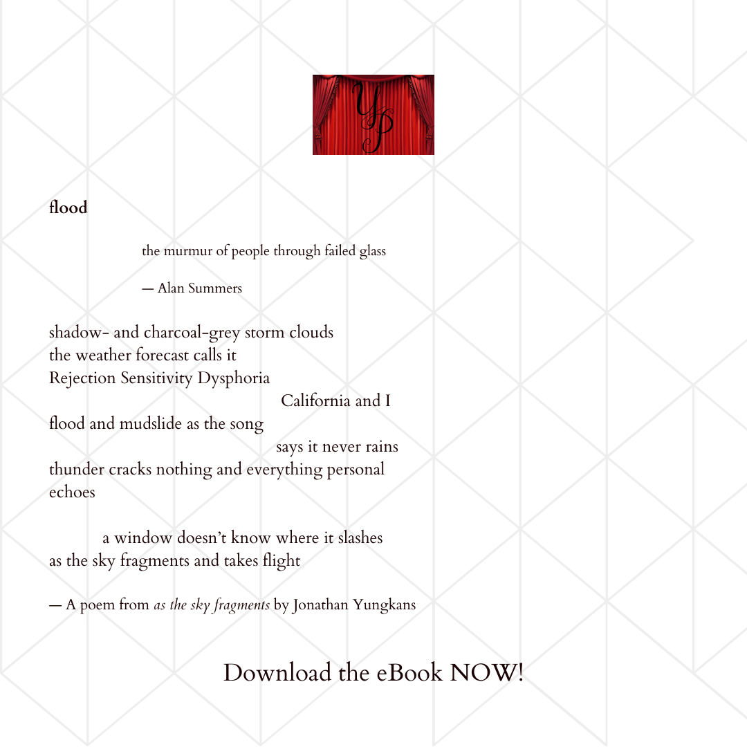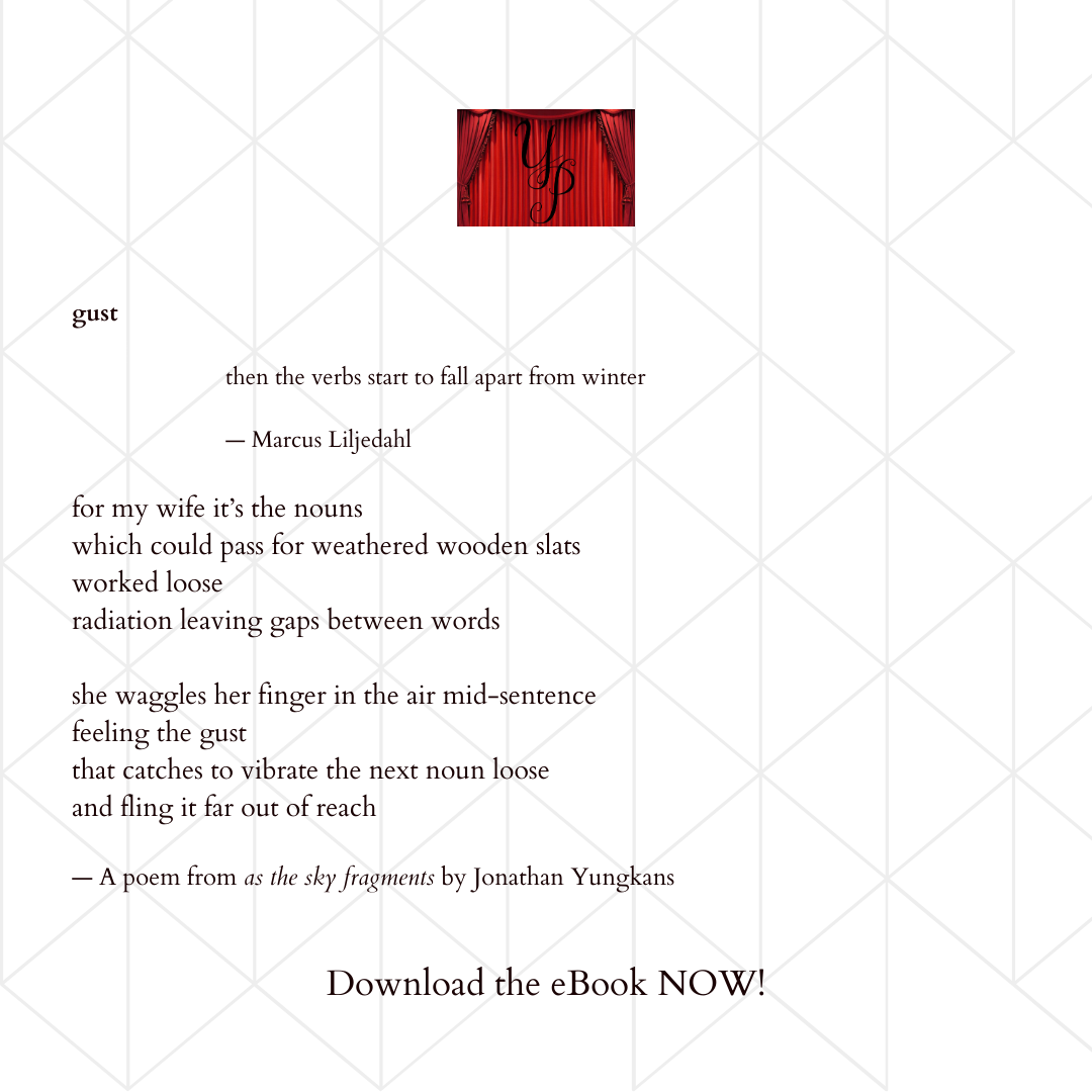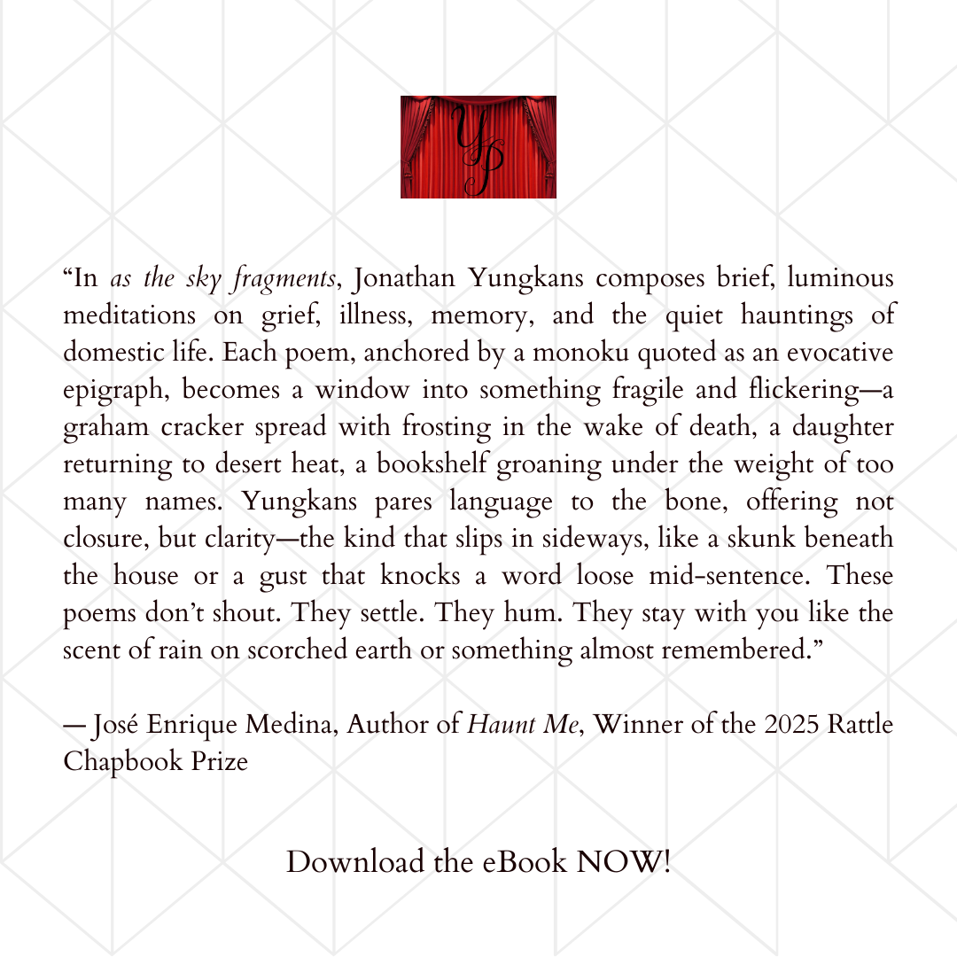 “In as the sky fragments, Jonathan Yungkans composes brief, luminous meditations on grief, illness, memory, and the quiet hauntings of domestic life. Each poem, anchored by a monoku quoted as an evocative epigraph, becomes a window into something fragile and flickering—a graham cracker spread with frosting in the wake of death, a daughter returning to desert heat, a bookshelf groaning under the weight of too many names. Yungkans pares language to the bone, offering not closure, but clarity—the kind that slips in sideways, like a skunk beneath the house or a gust that knocks a word loose mid-sentence. These poems don’t shout. They settle. They hum. They stay with you like the scent of rain on scorched earth or something almost remembered.”