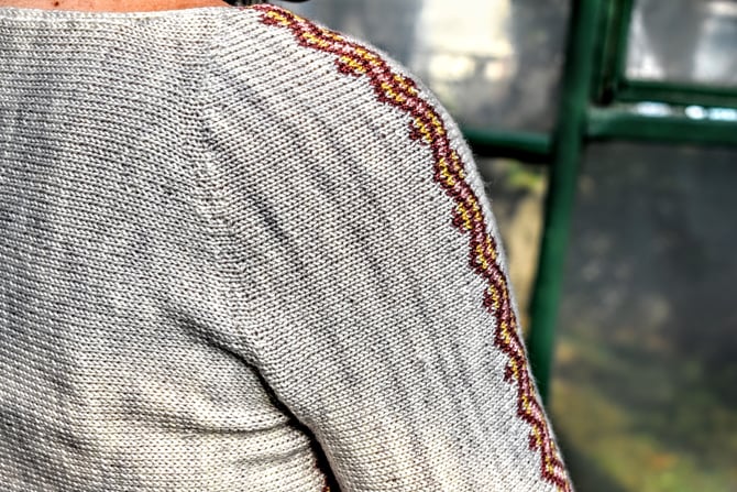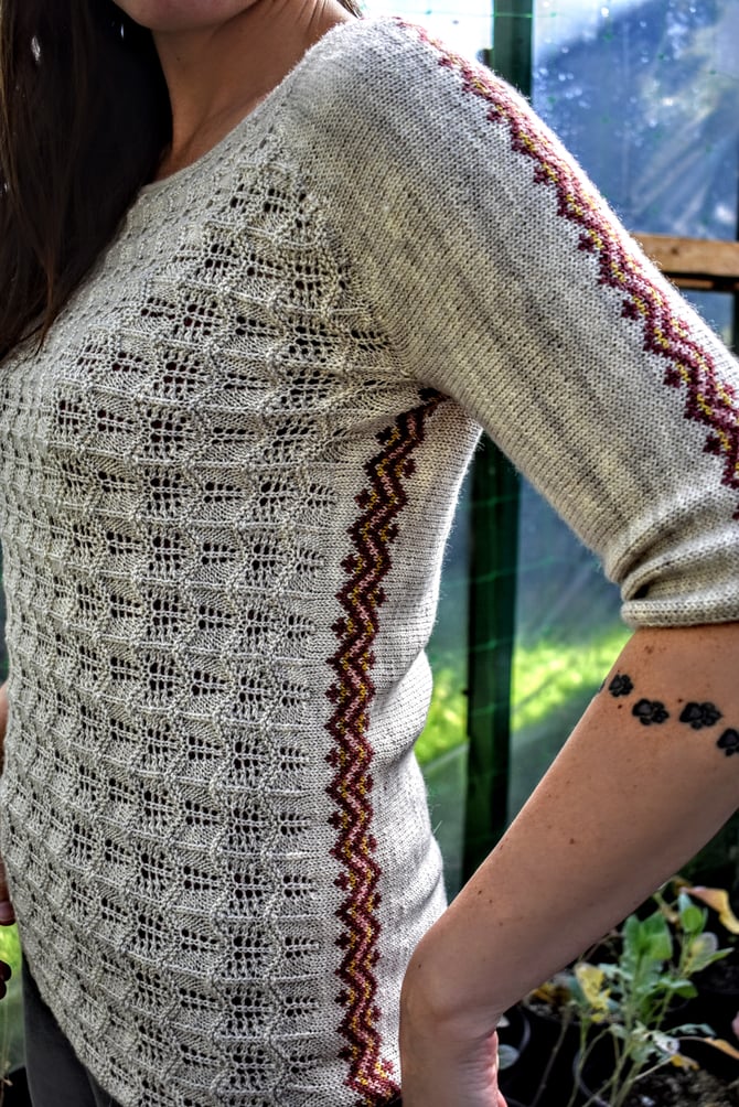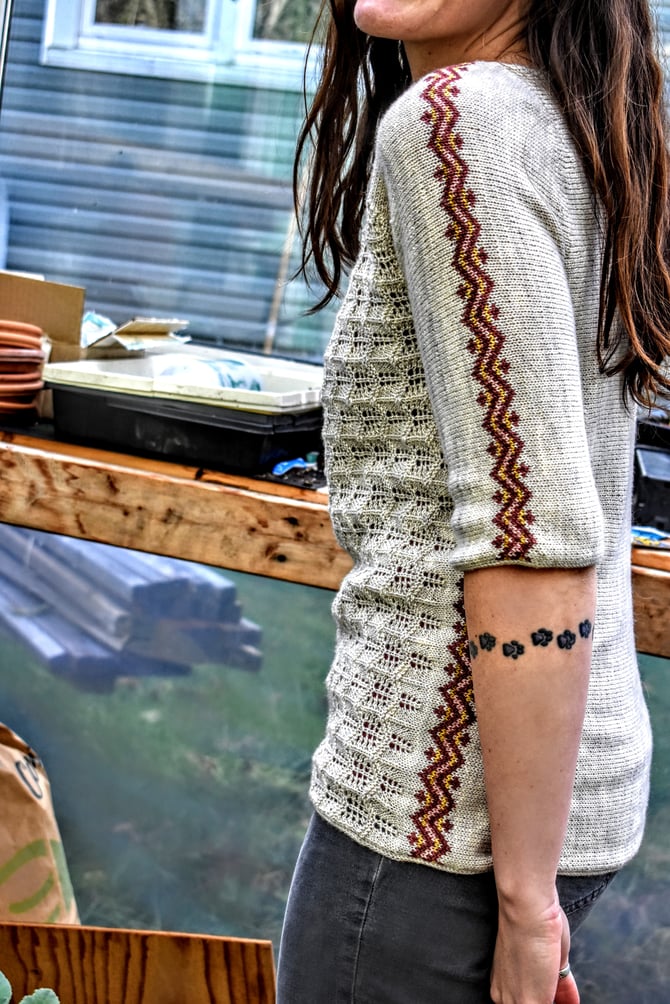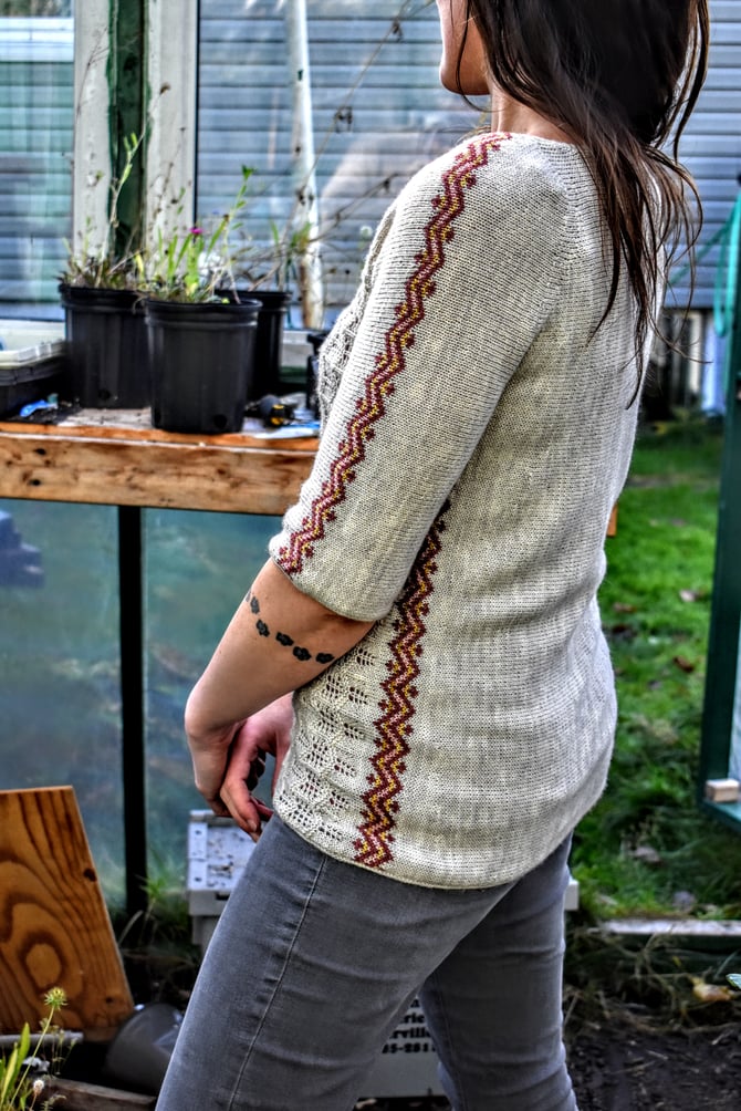 Ramea is knit completely sideways and seamlessly. The mock raglan shoulder lines are formed entirely by short rows, and the fair isle bands are worked in the round and steeked. The sweater is started with a provisional cast on for the right sleeve and the sleeve fair isle band is worked in the round and steeked. Short rows on either side of the band give the shoulder a raglan look, and the sleeve is grafted together. Next, a provisional cast on starts the right side of the body and the side fair isle band is worked in the round and steeked. The band is then joined to the sleeve along the front shoulder and the lace is worked flat across the sweater front. A provisional cast on starts the left sleeve and the sleeve is joined to the sweater front in a series of short rows. The fair isle band on the left sleeve is worked in the round and steeked, and more short rows are worked along the back shoulder before grafting the sleeve together. The fair isle band on the left side of the body is worked in the round and steeked, and joined to left sleeve along the back shoulder. Stockinette is worked across the sweater back with short rows over the bum for a little bit of extra room. The sweater is closed by grafting, and i-cords are worked around the collar, hem, and cuffs.