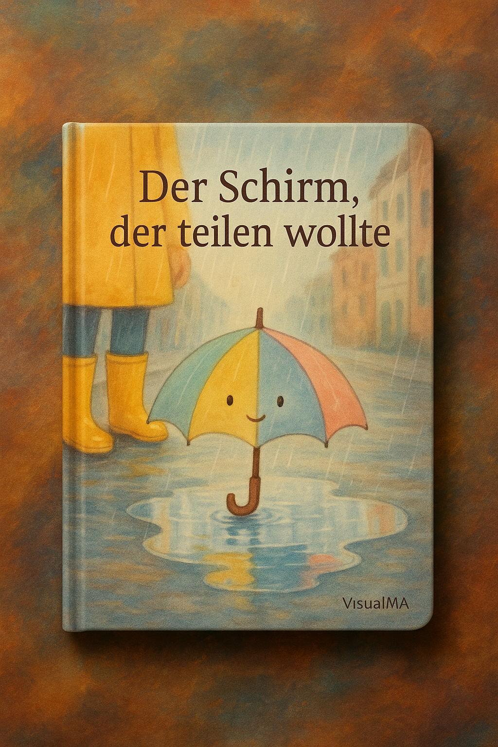 „Der Schirm, der teilen wollte“ ist ein liebevoll illustriertes Bilderbuch von VisualMA über ein Kind, einen bunten Schirm und die Entscheidung, nicht alles für sich zu behalten.
