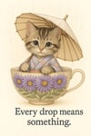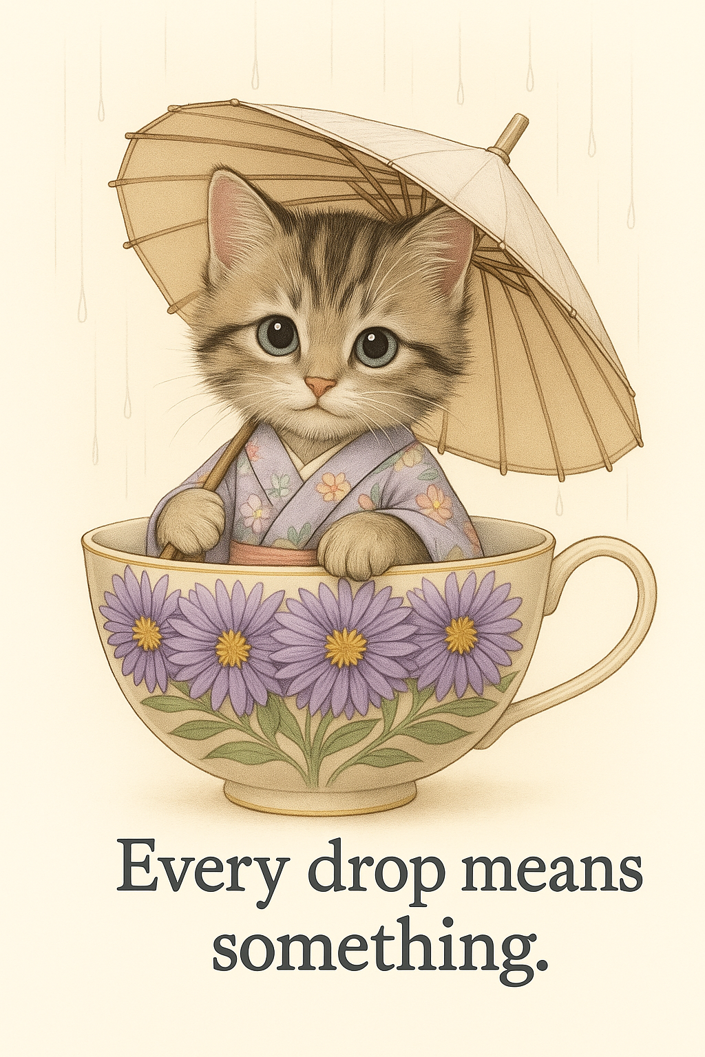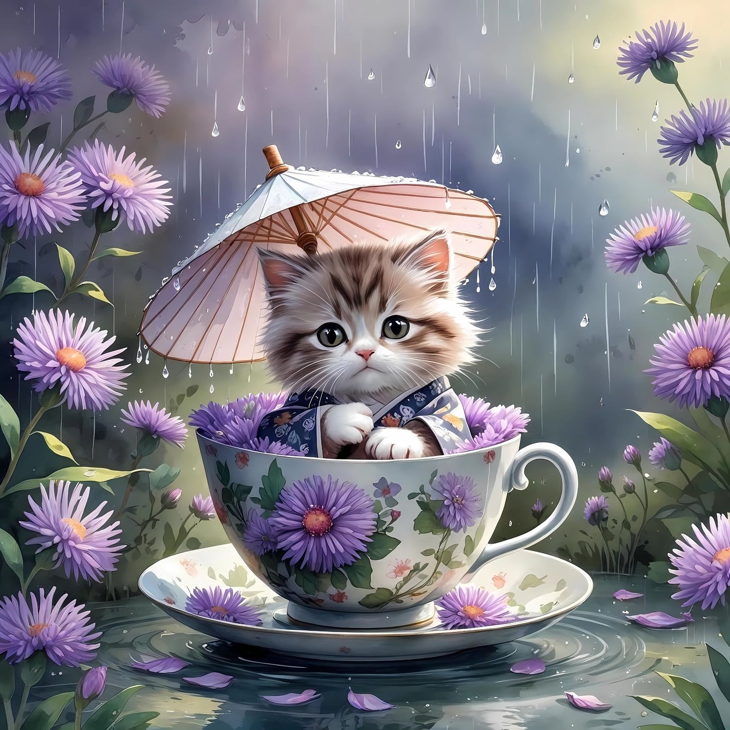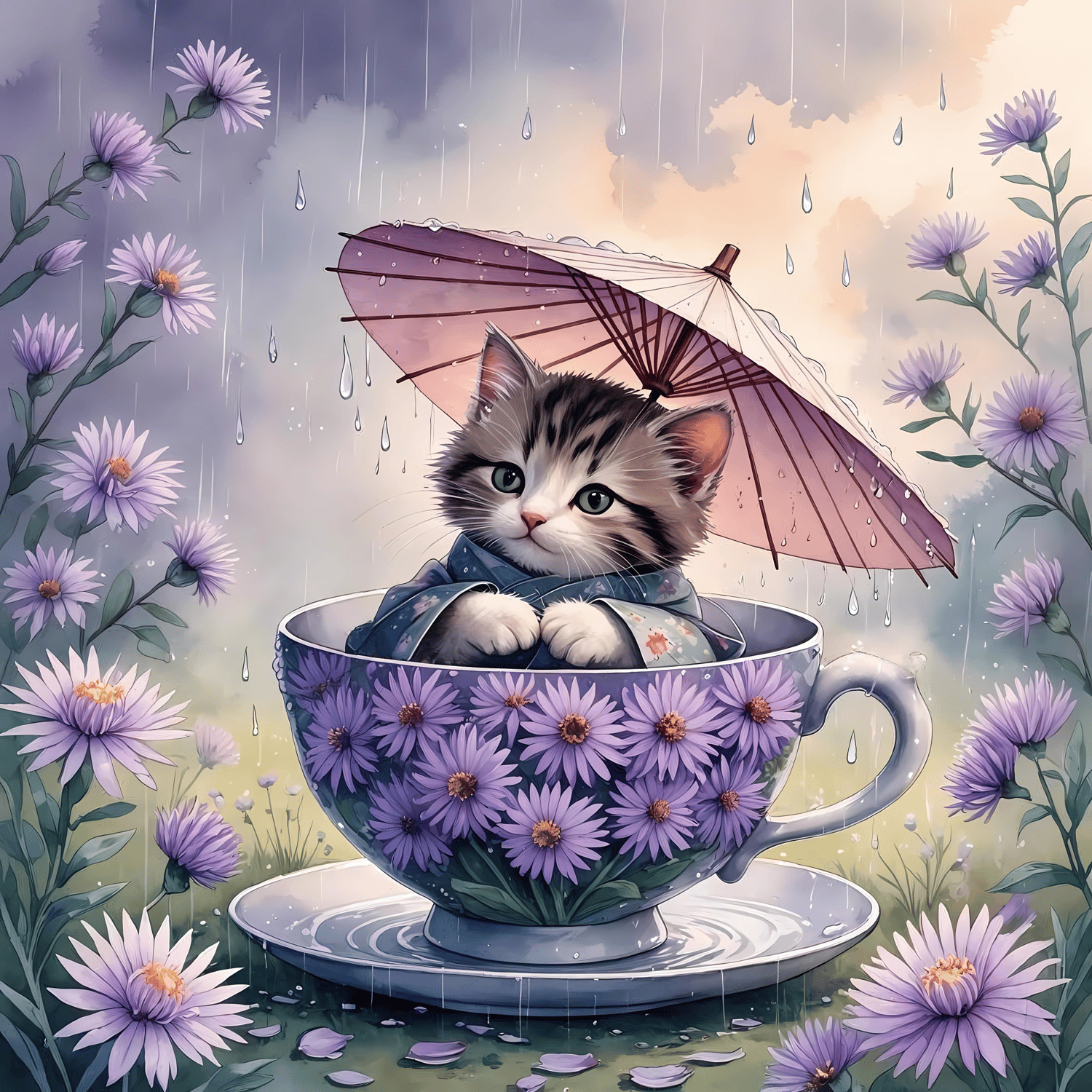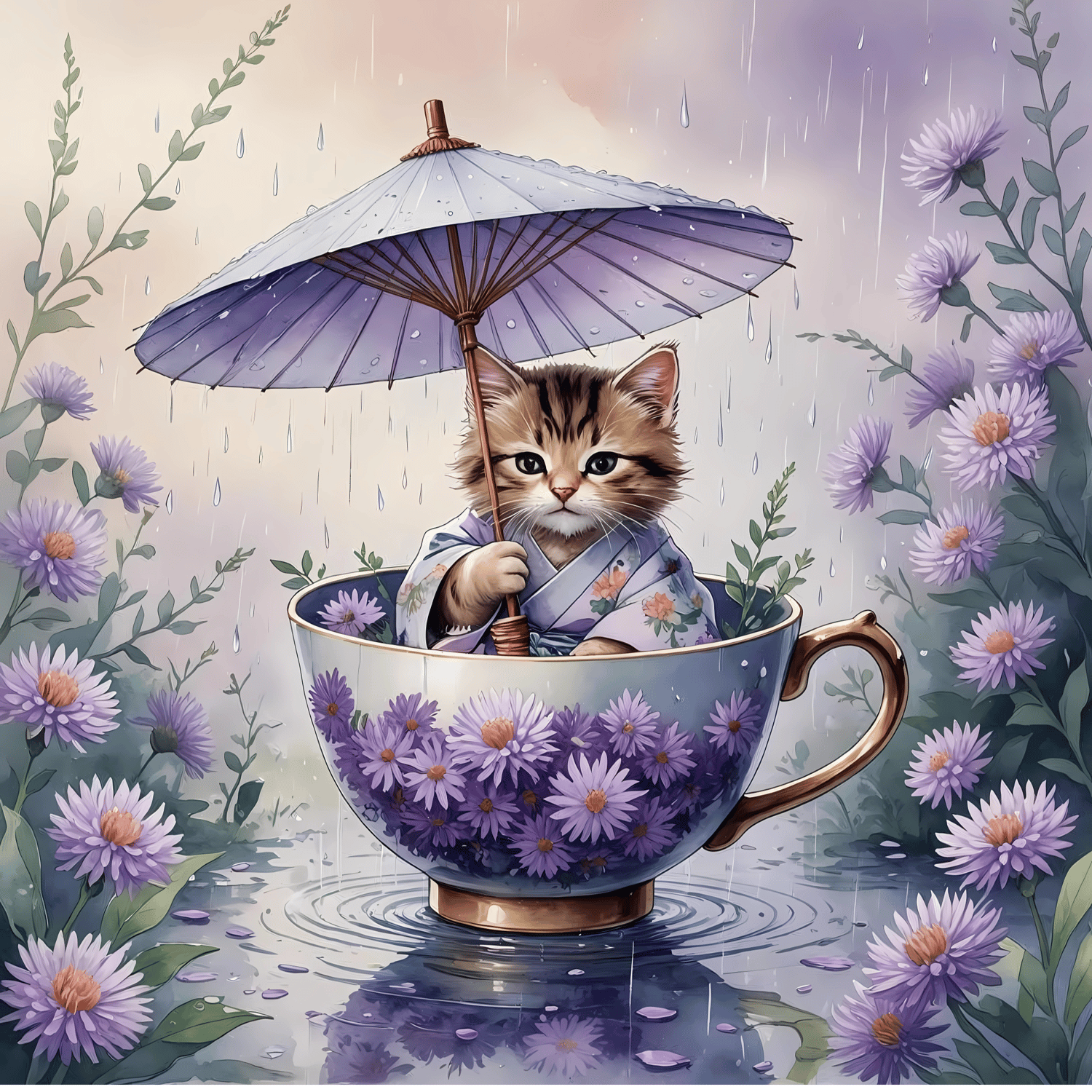 Celebrate the delicate beauty of September with this cozy, watercolor-style digital illustration featuring the birth flower of the month – the Aster. Nestled inside a teacup adorned with purple blooms, a gentle kitten in a soft floral kimono sits quietly beneath a paper parasol as raindrops fall like whispered thoughts. A serene piece filled with charm, calm, and a hint of introspection – perfect for journaling pages, art collectors, or seasonal décor lovers.
