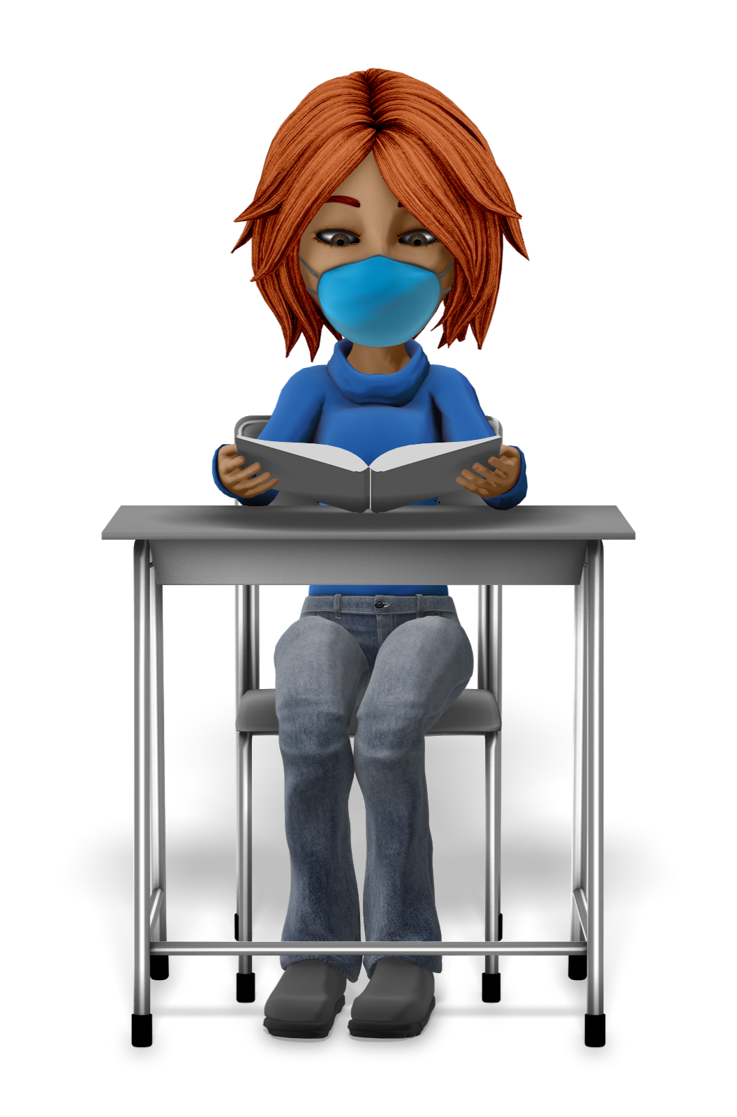 This clip art image shows a girl student sitting at a school desk reading a book while wearing a protective mask. Use this education clipart graphic to educate about coronavirus awareness in your school.