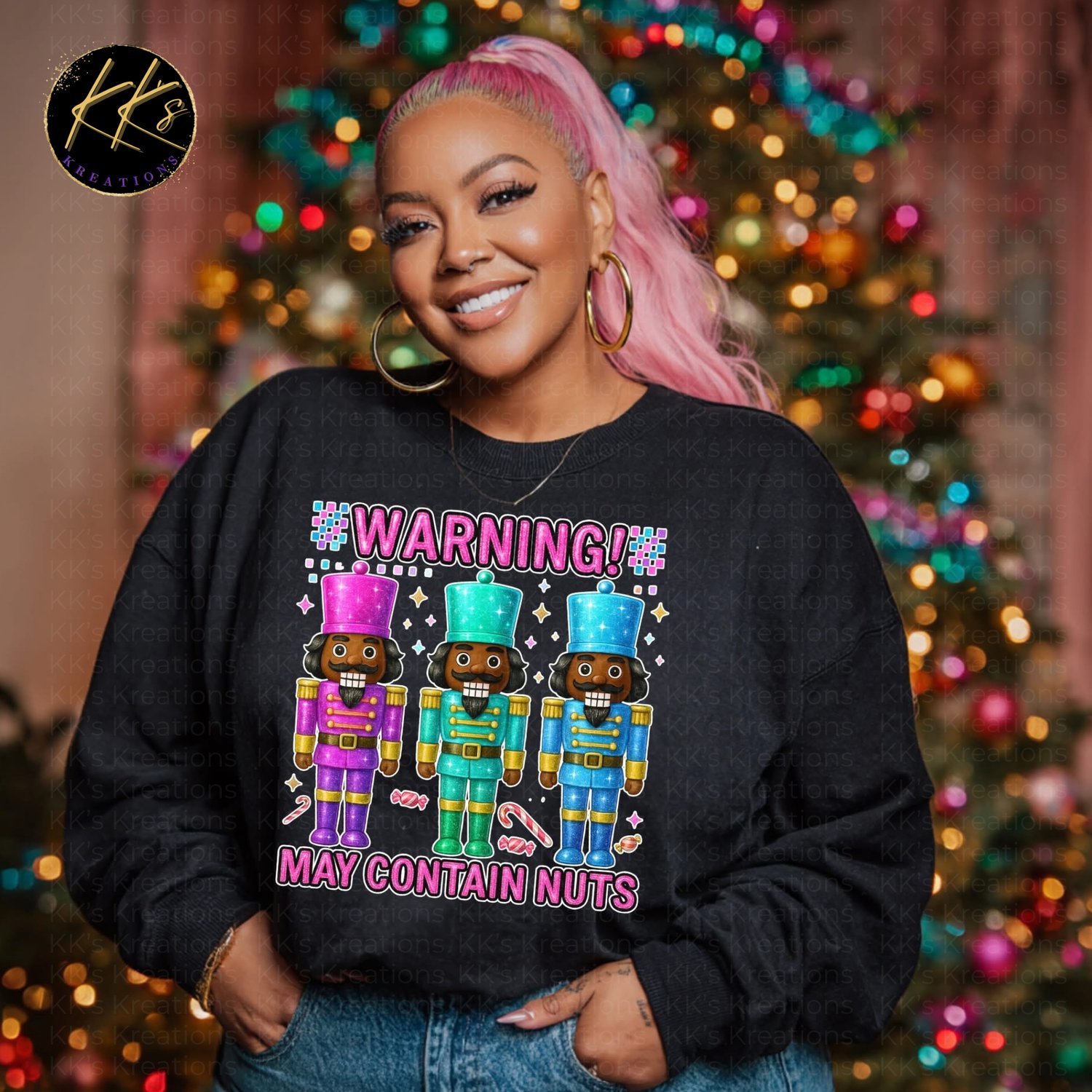 Add some playful holiday cheer to your wardrobe with this bold and festive sweatshirt! Featuring vibrant nutcracker designs in glitter-style colors and a fun “WARNING! MAY CONTAIN NUTS” phrase — this cozy crewneck is sure to turn heads at every Christmas gathering, office party, or family photo session.