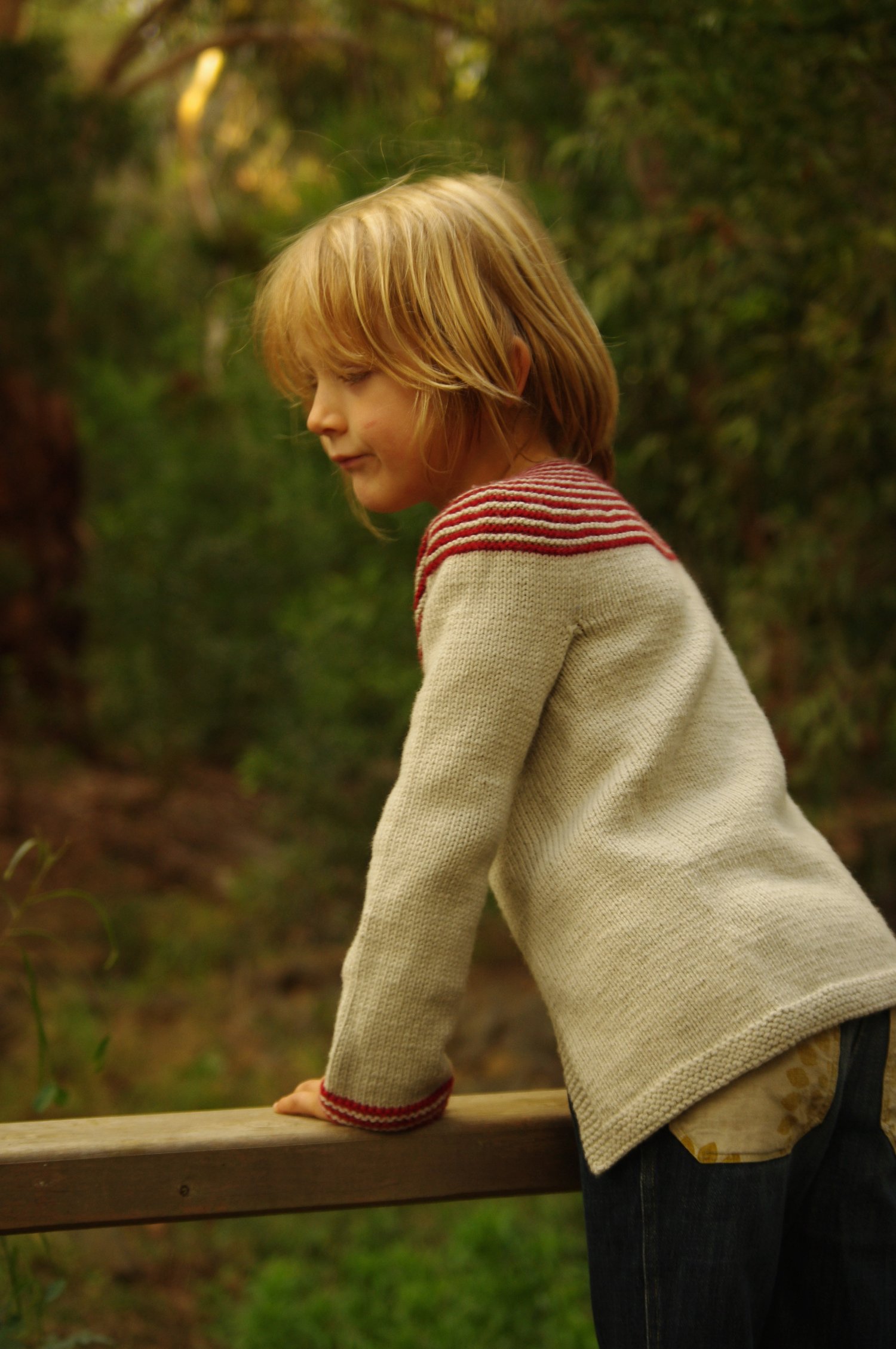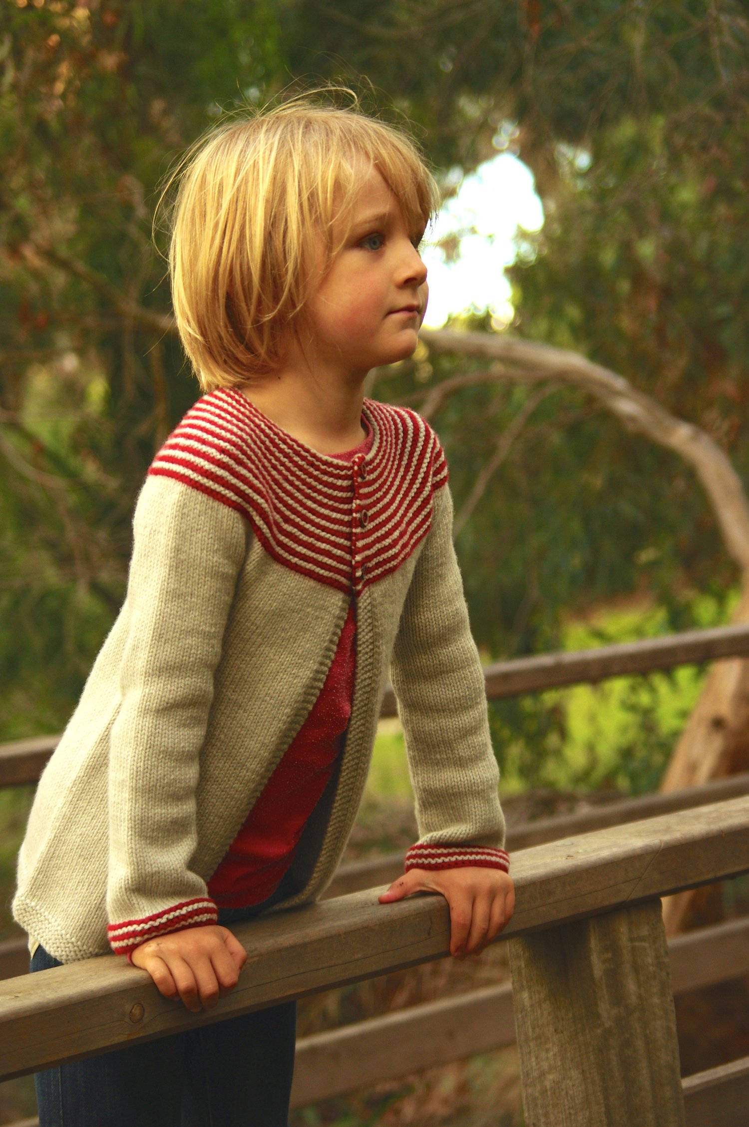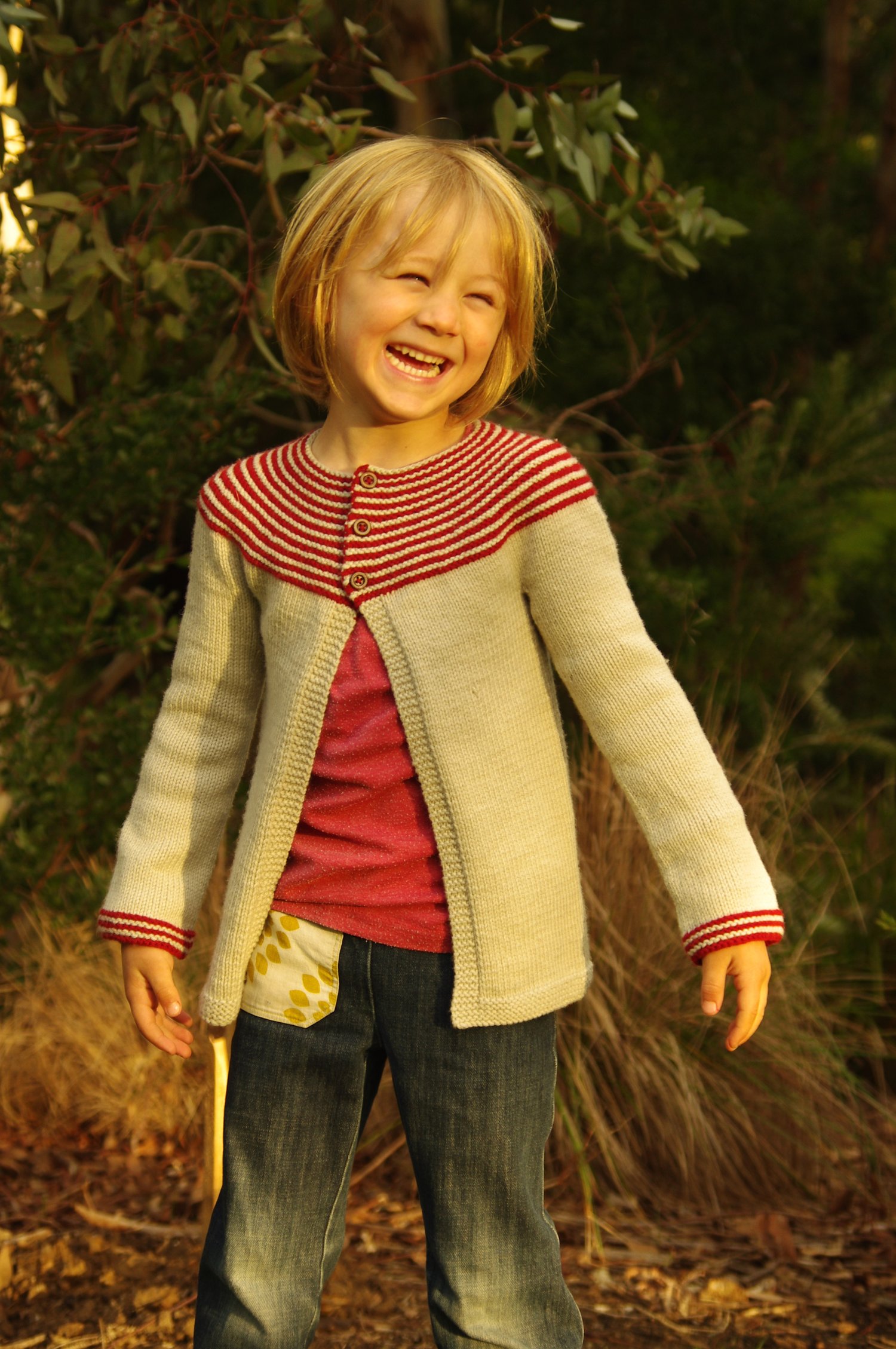 Gidday is a superbly simple cardigan. A striped garter stitch circular yoke is accentuated with cute buttons and a stocking stitch body.