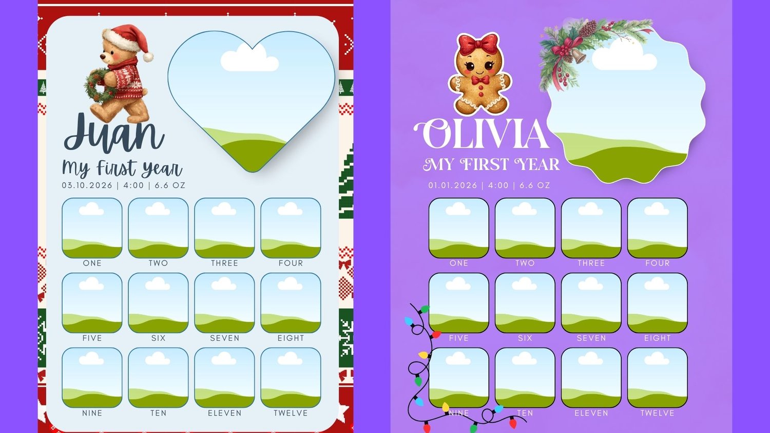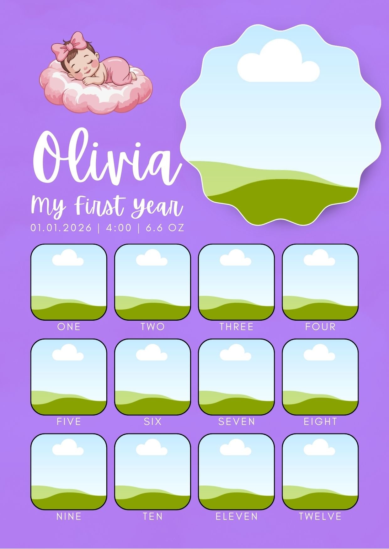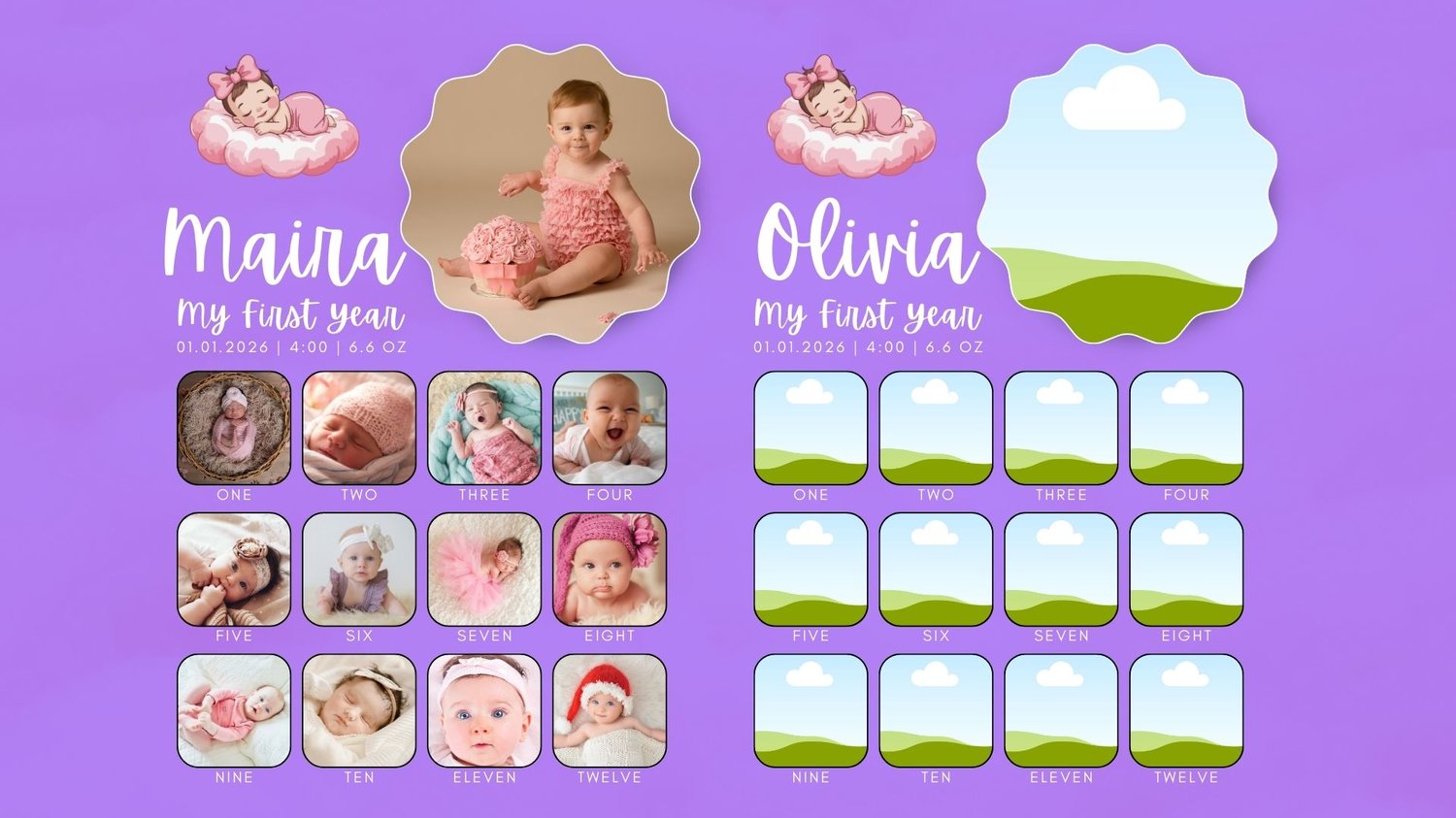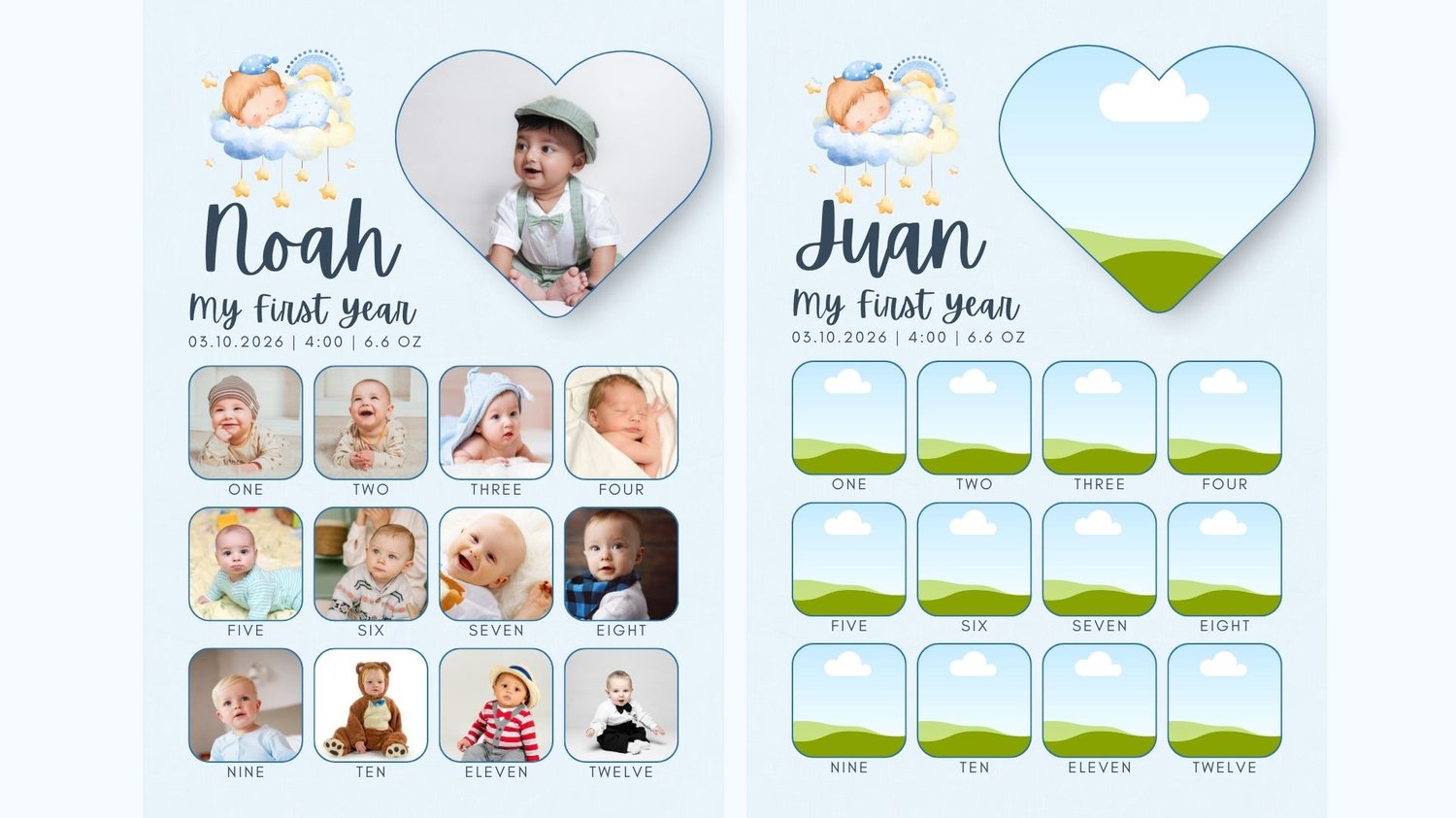 Capture every precious month of your little one’s journey with this adorable, easy-to-edit milestone collage. Simply drag and drop your photos into the frames!