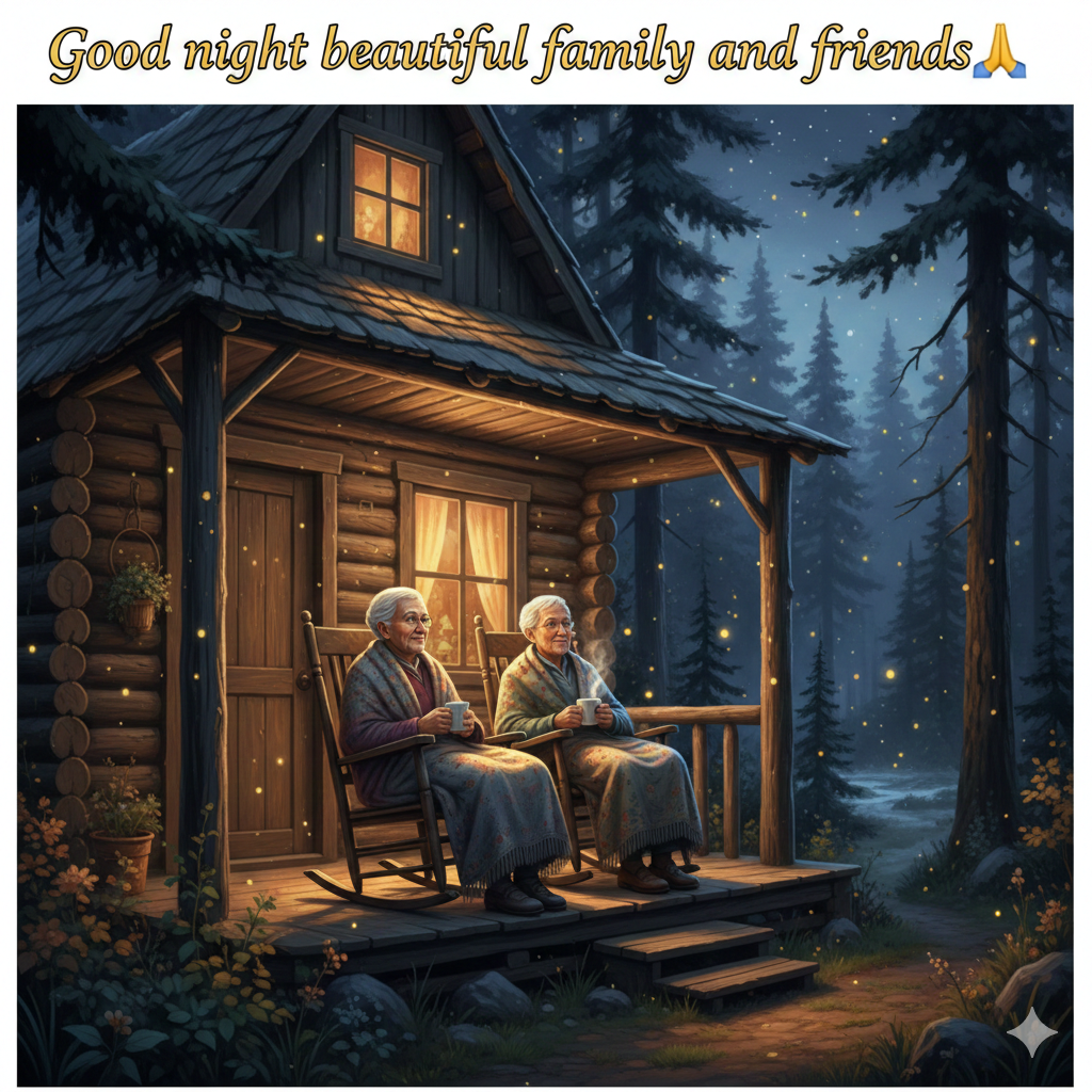 A beautiful good night scene of an elderly couple sitting together on wooden rocking chairs on the porch of a cozy cabin in the woods, surrounded by tall pine trees under a starry night sky, soft warm light glowing from the cabin windows, a gentle breeze rustling leaves, the couple wrapped in light blankets, sipping tea, peaceful and intimate atmosphere, fireflies glowing around, realistic textures of wood, fabrics, and nature, cinematic soft lighting, serene and heartwarming mood, high-resolution, ultra-detailed, painterly style.