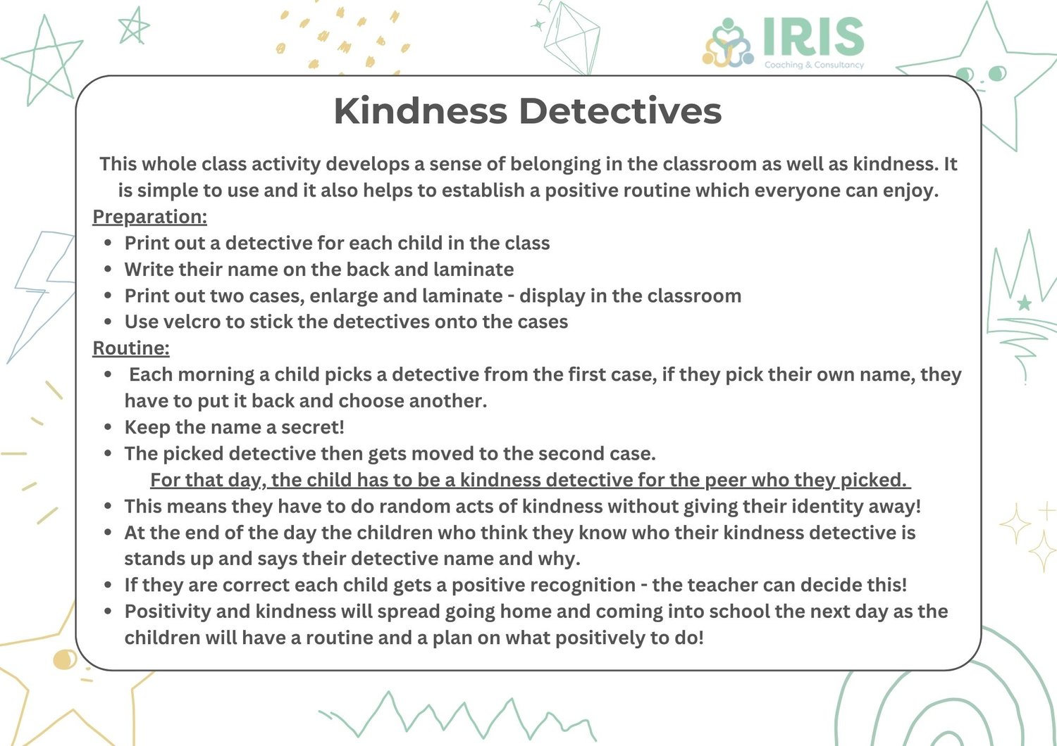 This whole class activity develops a sense of belonging in the classroom as well as kindness. It is simple to use and it also helps to establish a positive routine which everyone can enjoy.