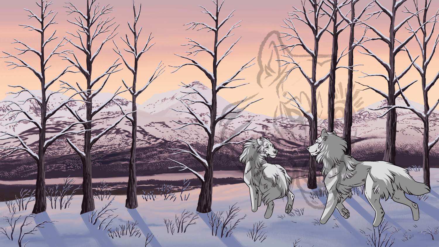 A base featuring a walking wolf couple. Shaded, coming with two seasonal backgrounds. Includes all elements as PNG files, as well as a PSD and Procreate file.