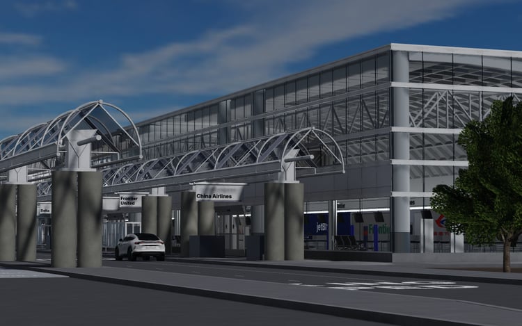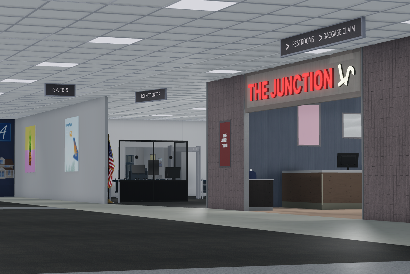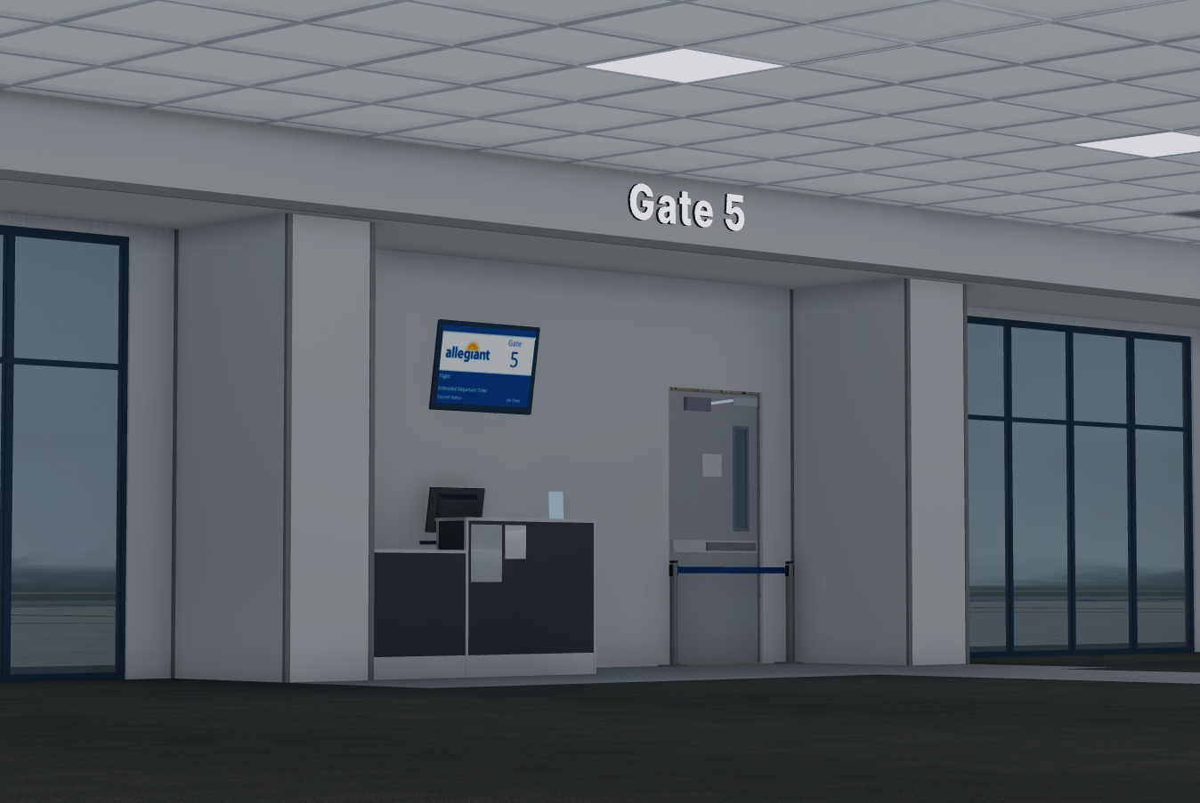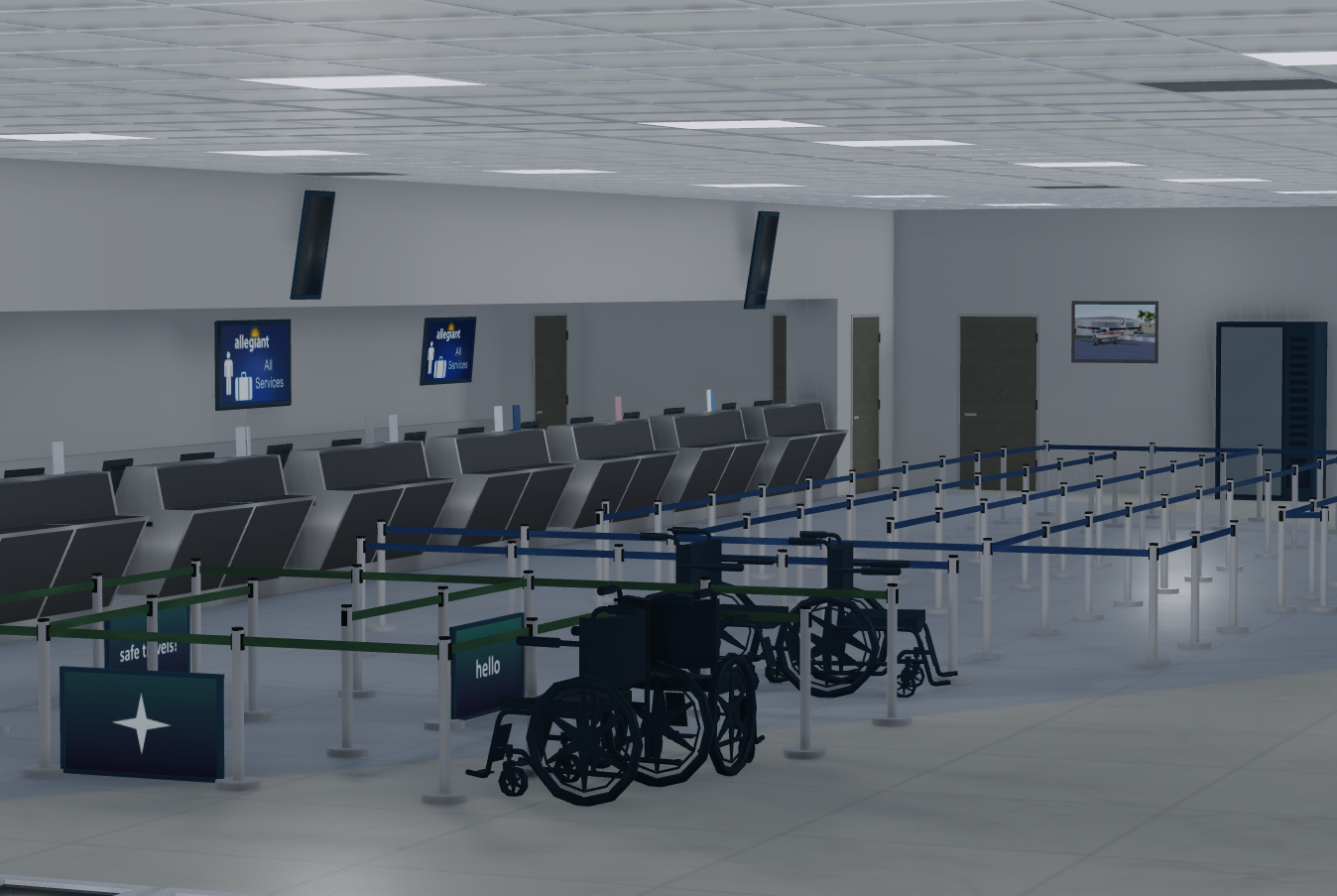 -Detailed interior with storefronts, check-in area, and security area. Does not include airport seats in gate area.