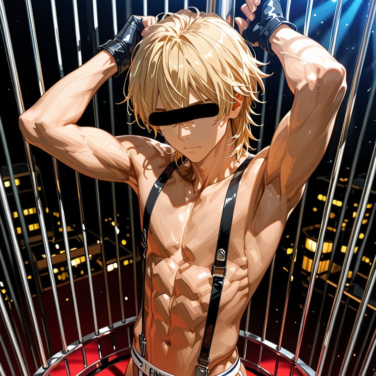 男性ショーダンサーをテーマに、ジョックストラップとサスペンダーを着せて、ポールと鳥かごをテーマに、キャラクターの魅力を存分に表現しました。