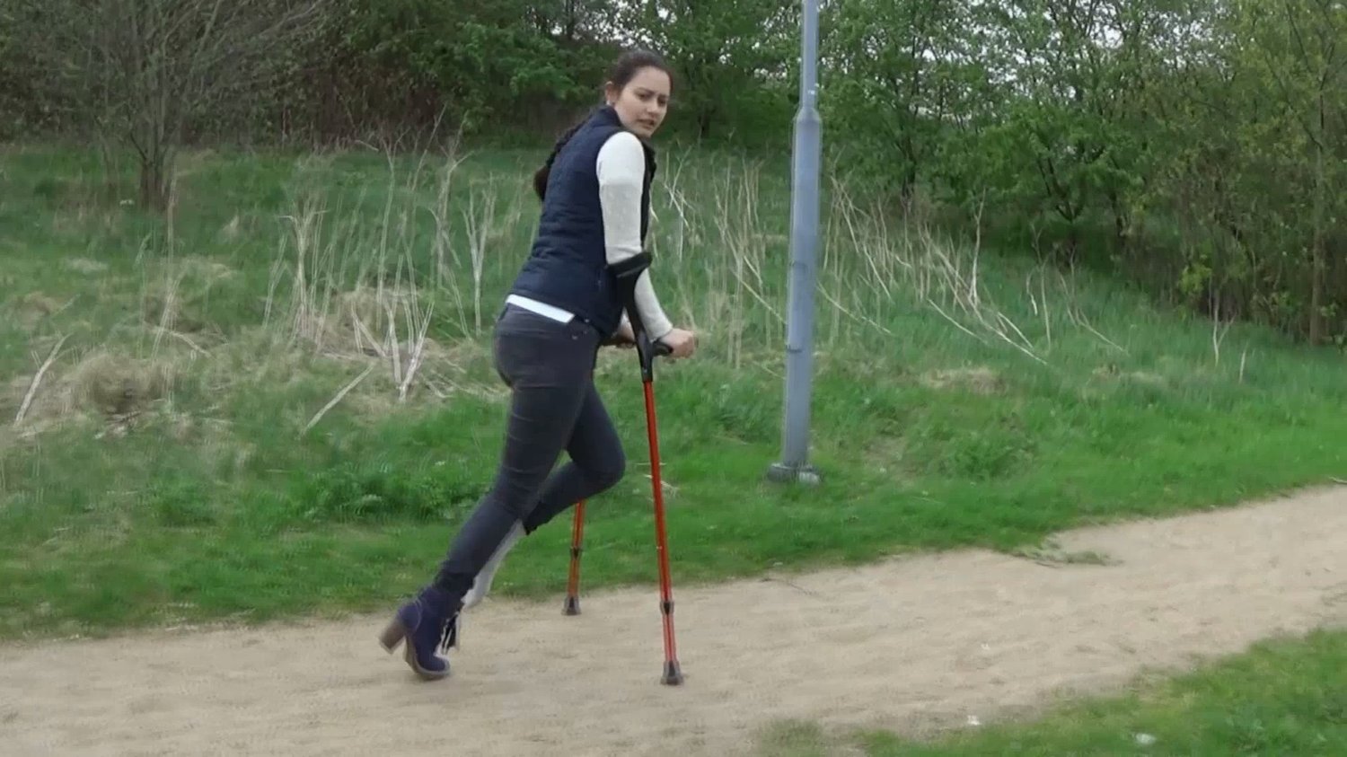 Elisabeth has a shoe with heel on her right foot and only a sock on her injured left foot.She crutch from the car in to a walkway how goes to a running way in the park.Elisabeth starts crutching along this way and soon find out that it´s maybe not done to use crutches on.First she must crutch a lot up for the path and when she is tired she put her injured leg up on a crutch to rest so we can see her grey sock better.