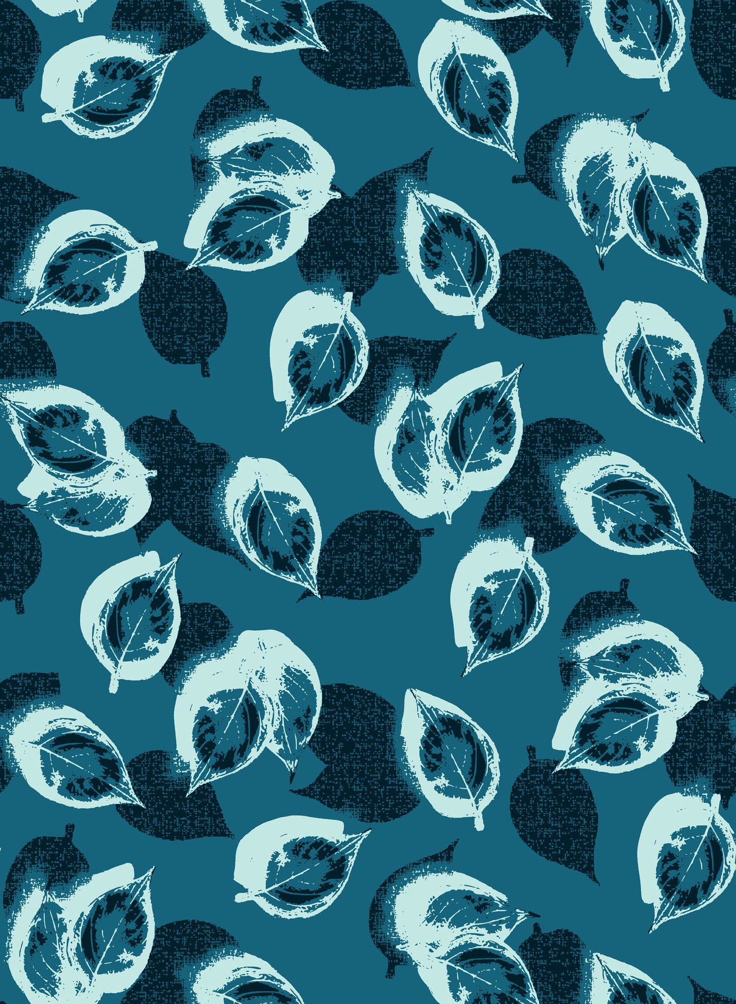 Layered leaf silhouettes with intricate textures on a deep teal ocean background.