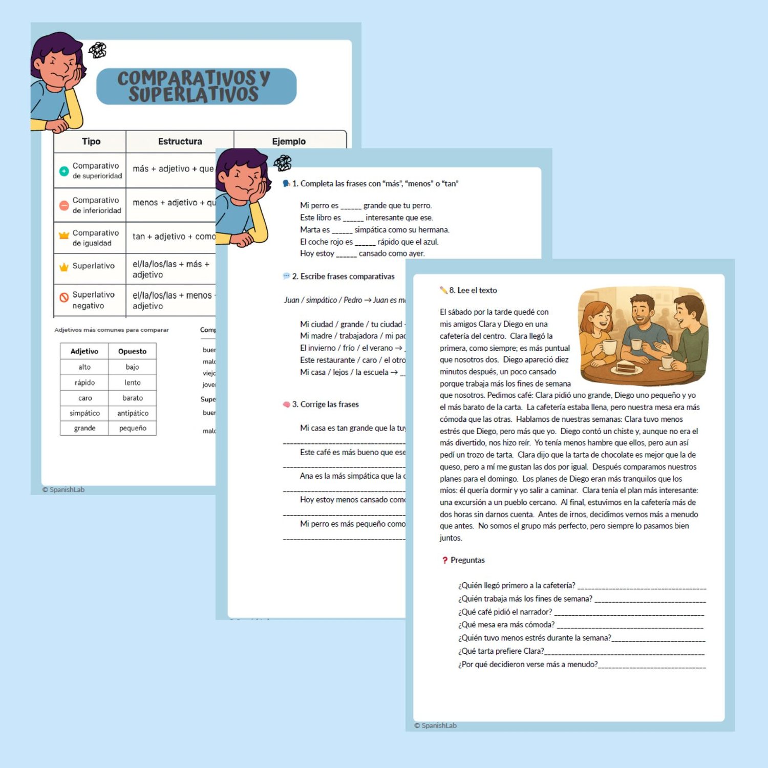 This Comparatives and Superlatives in Spanish worksheet is a clear, practical, and fun tool to help your A1–A2 level students master one of the most important grammatical structures in Spanish.