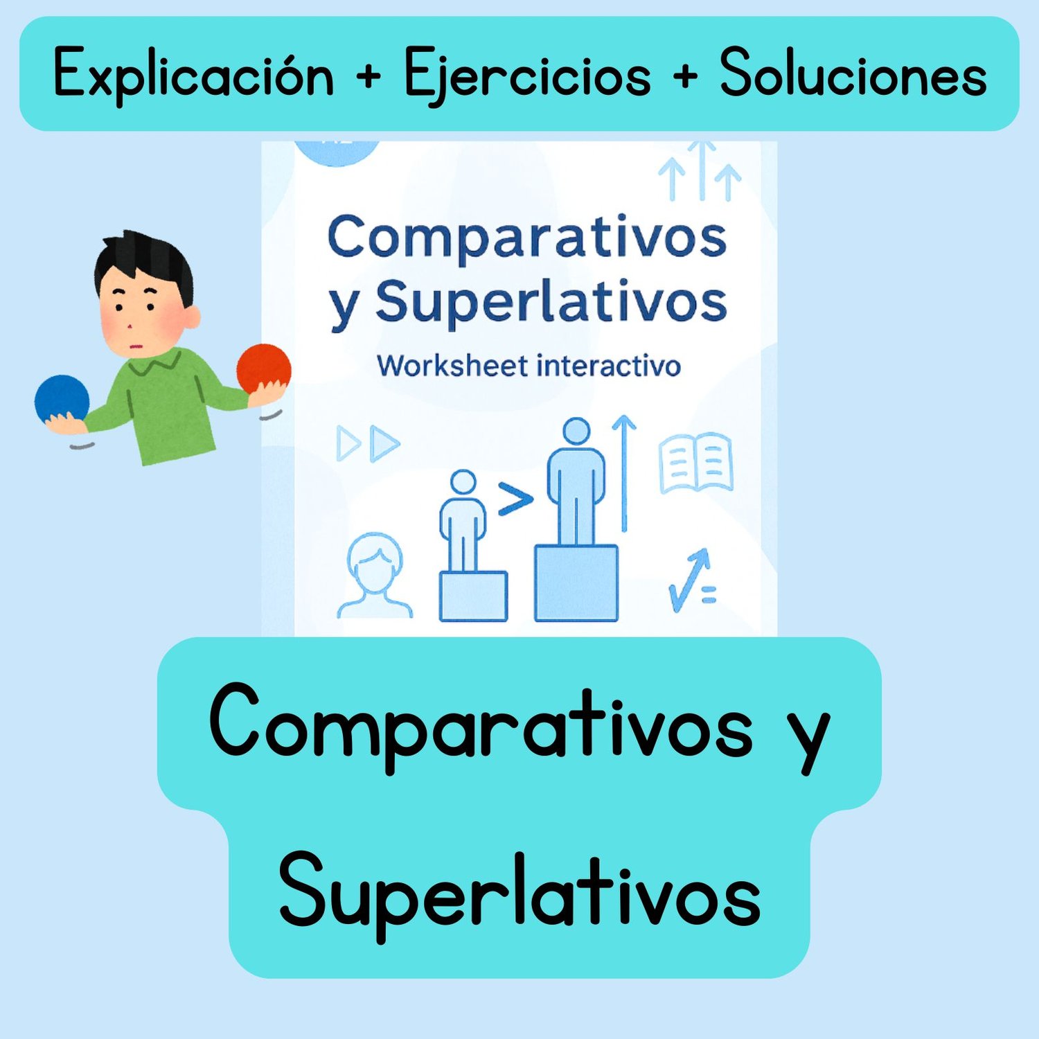 It includes explanatory tables, easy examples, a variety of exercises, and interactive activities that make it easier to understand and use más que, menos que, tan como, and superlatives in real contexts.