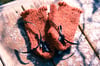 Professor Pomona Sprout’s fingerless mitts reflect her personality; earthy, robust, and ready for hard work. Cast on provisionally at the outer edge of the hand, the fingerless Pomona Mitts are worked flat using short rows, then grafted for a seamless finish. The flared cuff and spikey picot edge, and an optional decorative satin ribbon laced through the eyelets on the back of the hand, provide detailed embellishment. A rich and tweedy yarn brings depth and texture to the fabric, making a rustic contrast to the sleek and shiny ribbon.