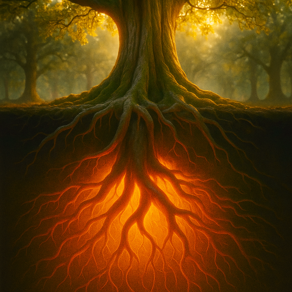 This is not the fire that devours, nor the torch that dazzles. The Rooted Flame breathes underground, hidden in the veins of the roots, carrying its ember upward in silence. It burns without consuming, feeding patience and continuity. Every leaf, every stretch of branch skyward is nourished by this secret blaze.