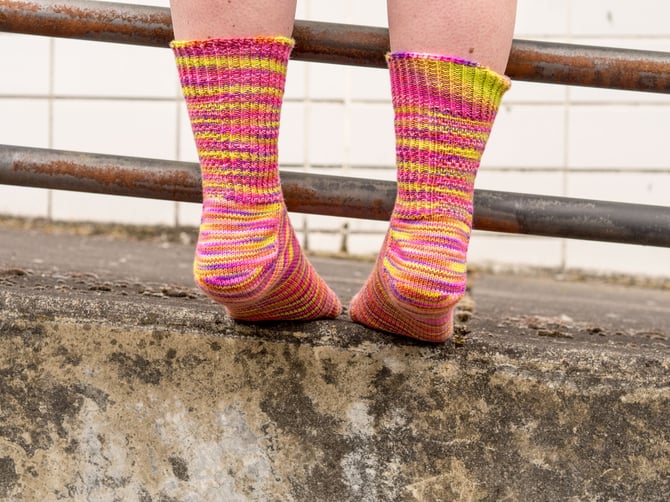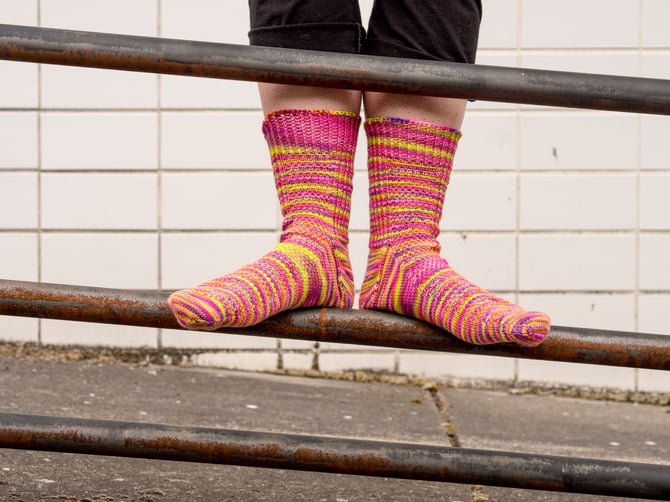 Inspired by life in the slow lane on the 59th Street Bridge, these toe-up socks are a joyful challenge to knit. The combination of modified linen stitch and twisted ribbing play oh so nicely with a highly variegated skein of yarn, and, in sport-weight yarn, these socks are squishy and comfy to wear.