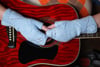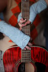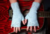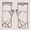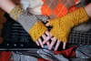 custom fit fingerless mitts with swirling textured design around flared wrists