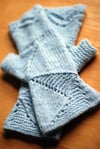These fingerless mitts are custom sized to fit your hands, and can be made in any gauge. There are two different design options for the top hand section, as well as a 2-color option. They are filled with swirling twisted stitches, decreases, eyelet holes, and garter stitch texture.