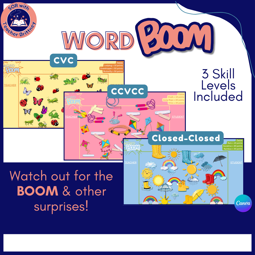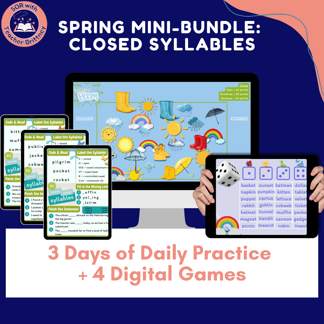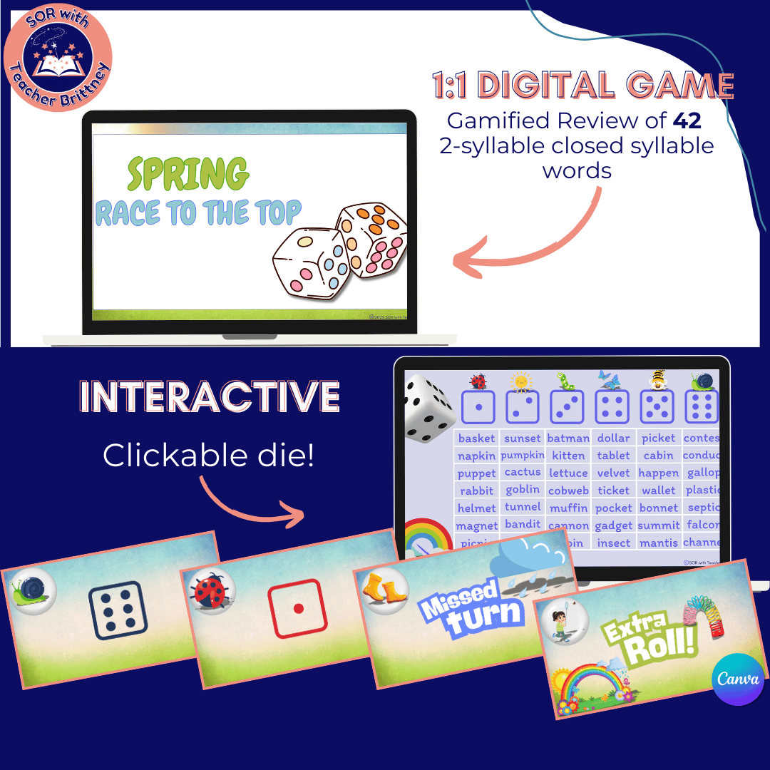 Boost decoding skills with this spring-themed phonics bundle—perfect for online tutors and 1:1 instruction! Includes 3 printable warm-up worksheets and 4 interactive digital games (Canva Pro), all focused on 2-syllable closed syllable words (+CVC & CCVCC). Students will love playing Word Boom and Race to the Top while practicing blending, phonemic awareness, and decoding. Ideal for lesson warm-ups, end-of-lesson rewards, or targeted literacy intervention. Designed for online reading tutors using structured literacy or Science of Reading approaches.
