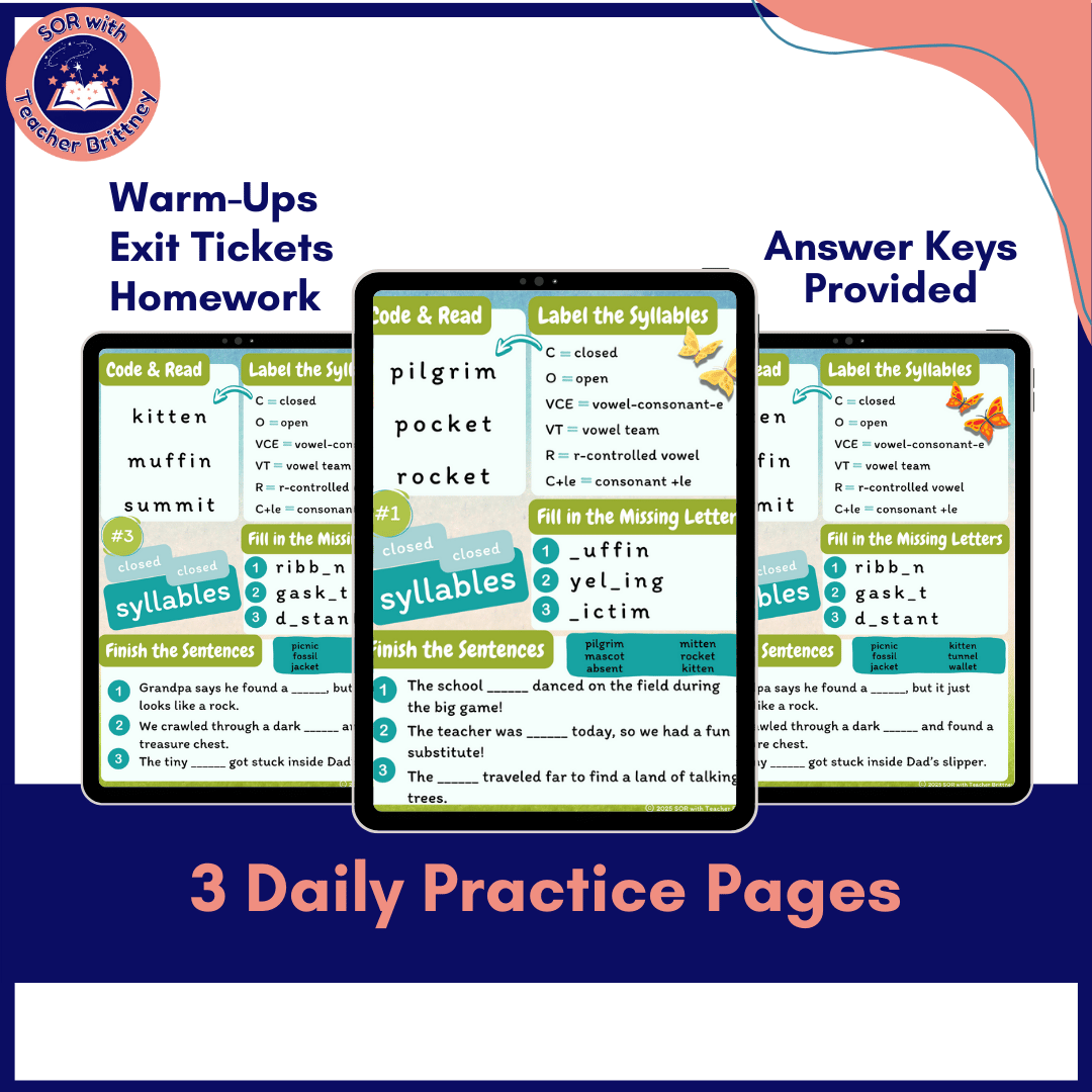 - 3 Levels of Difficulty: CVC, CCVCC, and 2-syllable closed syllables