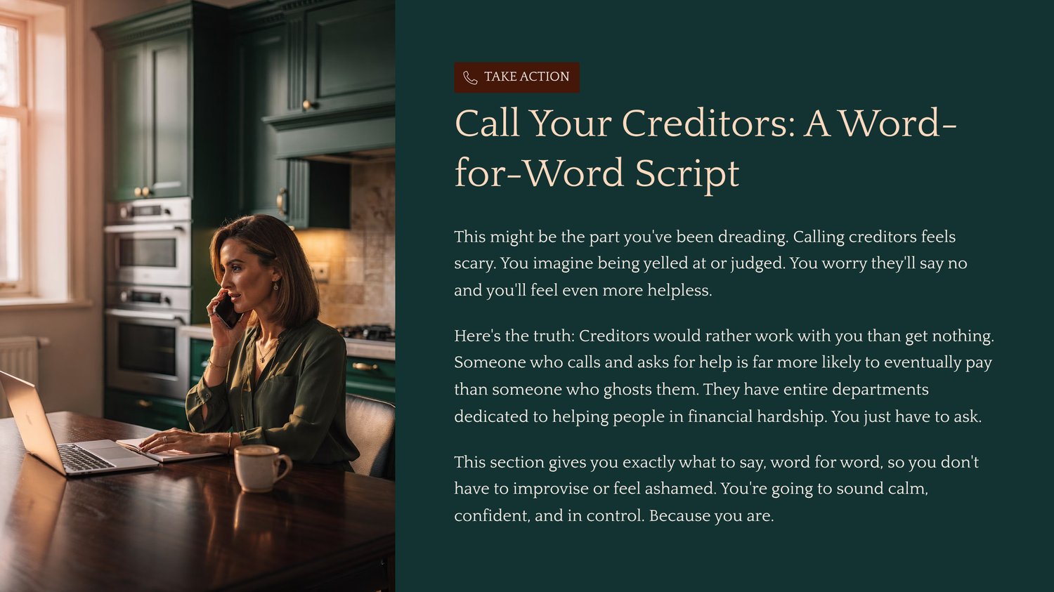 Working moms behind on bills who don't know which to tackle first. Anyone drowning in multiplying late fees. People who need to call creditors but don't know what to say. Families one emergency away from shutoff. Smart, hardworking people who got knocked off balance and need to stabilize fast.