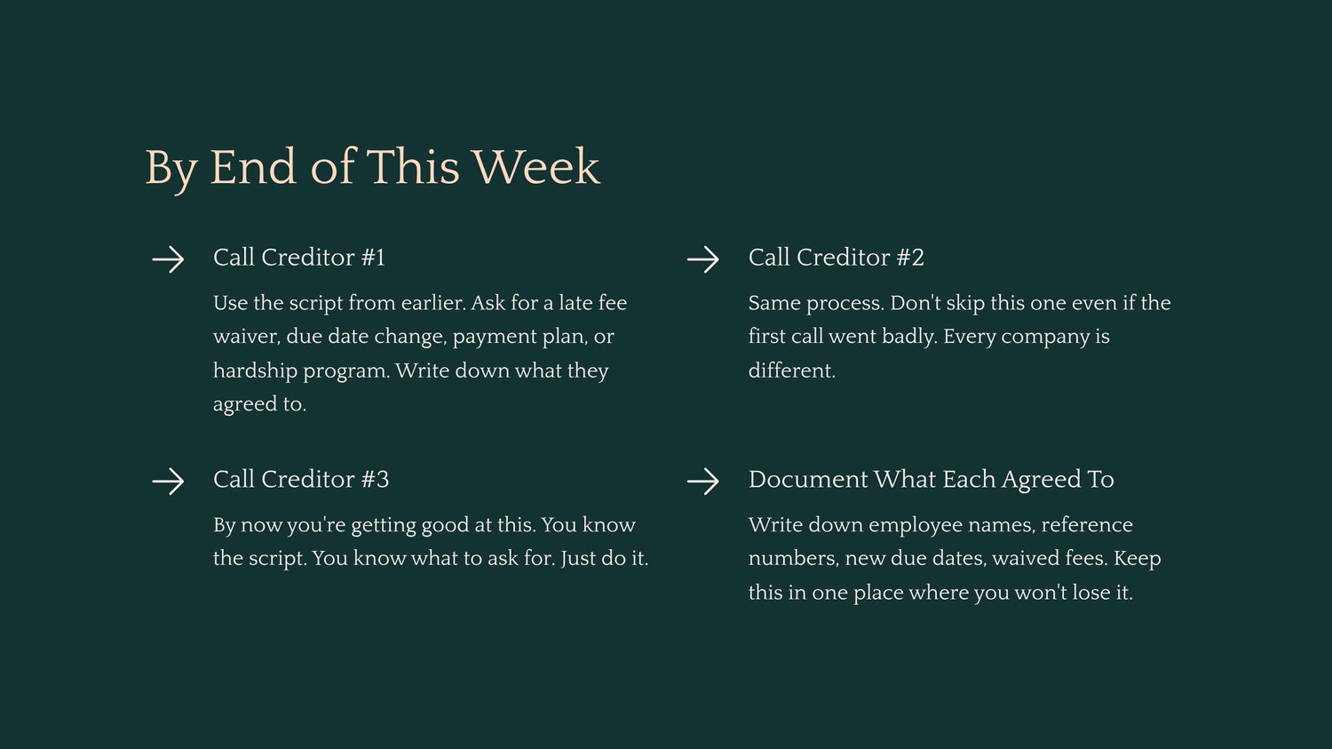 Within one week you'll have called 3 creditors using the scripts, identified which 3 bills are draining you fastest, paid bills in priority order protecting shelter and food first, and documented everything so companies can't take advantage. The strategies have helped people waive $420-$600 yearly per creditor in late fees, get interest rates reduced from 24% to 18%, avoid $200-$500 reconnection fees, and find thousands in assistance.