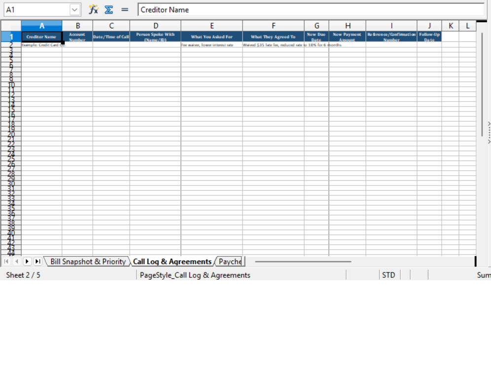 📊 Interactive Spreadsheet Tracker with 5 powerful sheets: Bill Snapshot (color-coded by urgency, auto-calculates days overdue), Call Log (document every creditor promise so they can't "forget"), Paycheck Allocation Planner (see exactly which bills to pay from each check), Late Fee Impact Calculator (visual proof of how much money you're losing), and Weekly Action Checklist (bite-sized tasks with checkboxes).