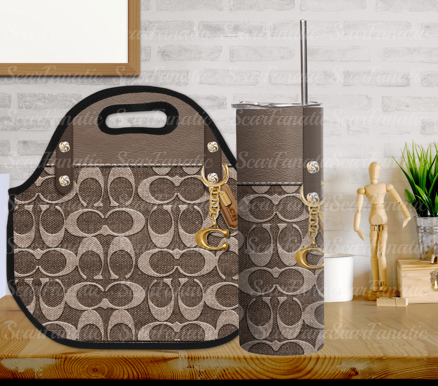Tan Jute Gold Silver Denim and Leather Purse Look 20oz Skinny Tumbler and Lunch Tote Design Bundle PNG