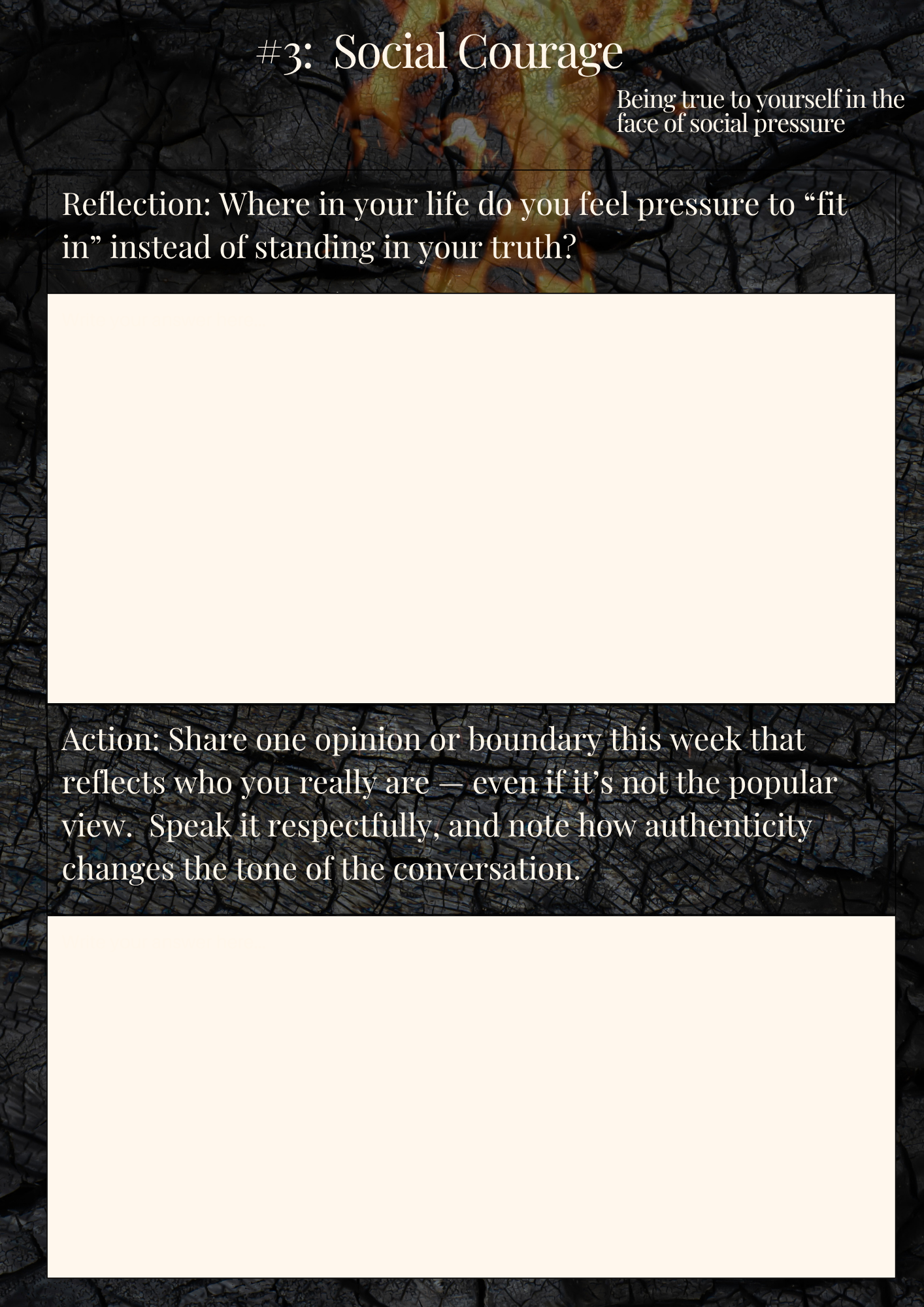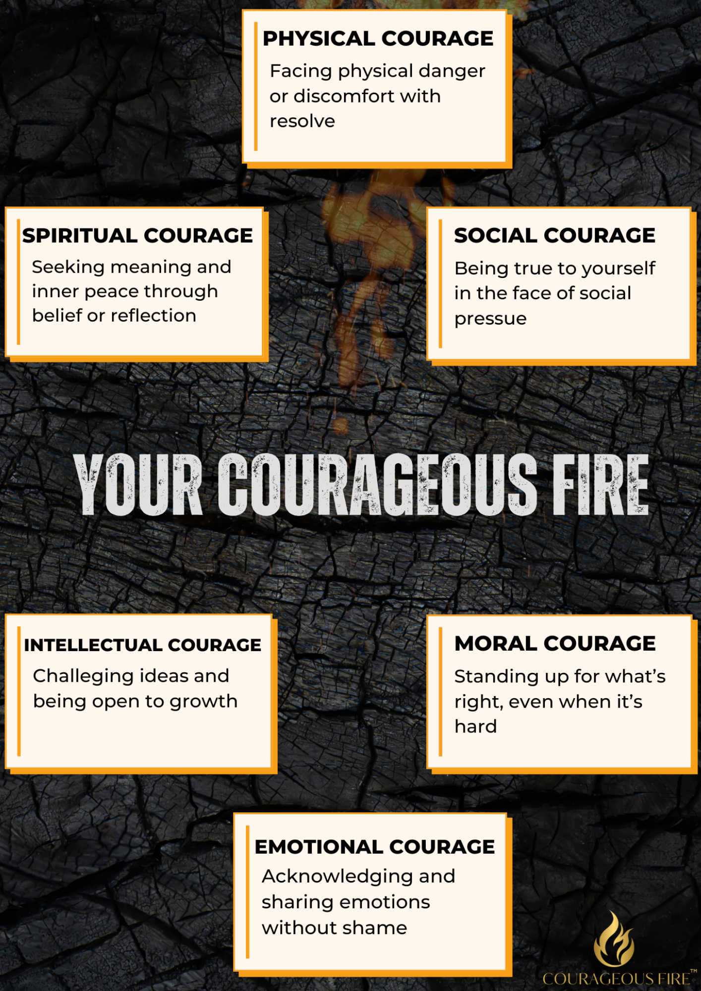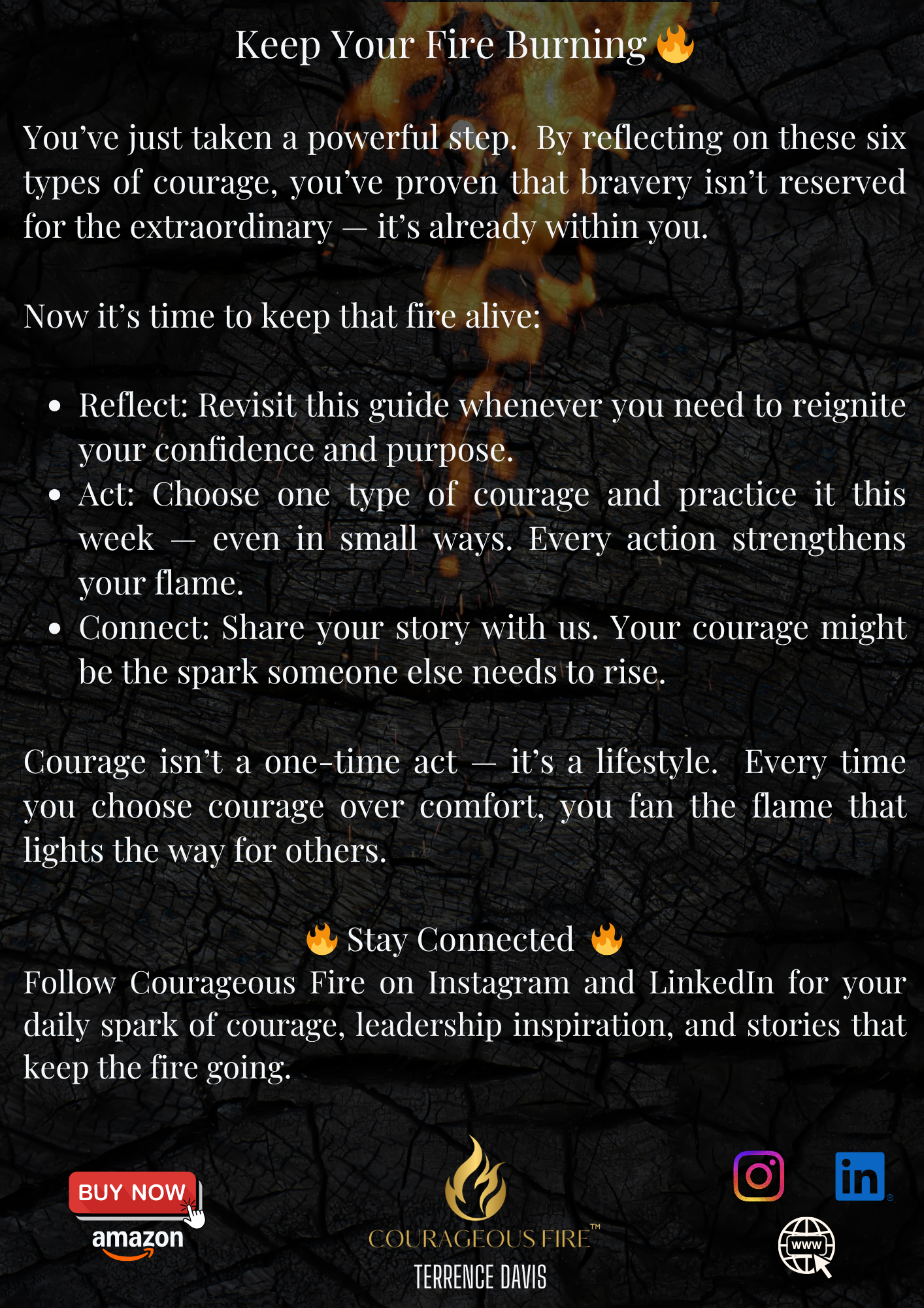 This quick-start guide introduces you to six powerful types of courage — spiritual, physical, social, intellectual, emotional, and moral. Each one is a spark that can ignite growth and transformation in your life and leadership. Inside, you’ll find short reflections and simple actions designed to help you live courage with intention — one choice at a time. This isn’t theory. It’s your invitation to start. Your courageous fire is already within you — now, let’s fan the flame.