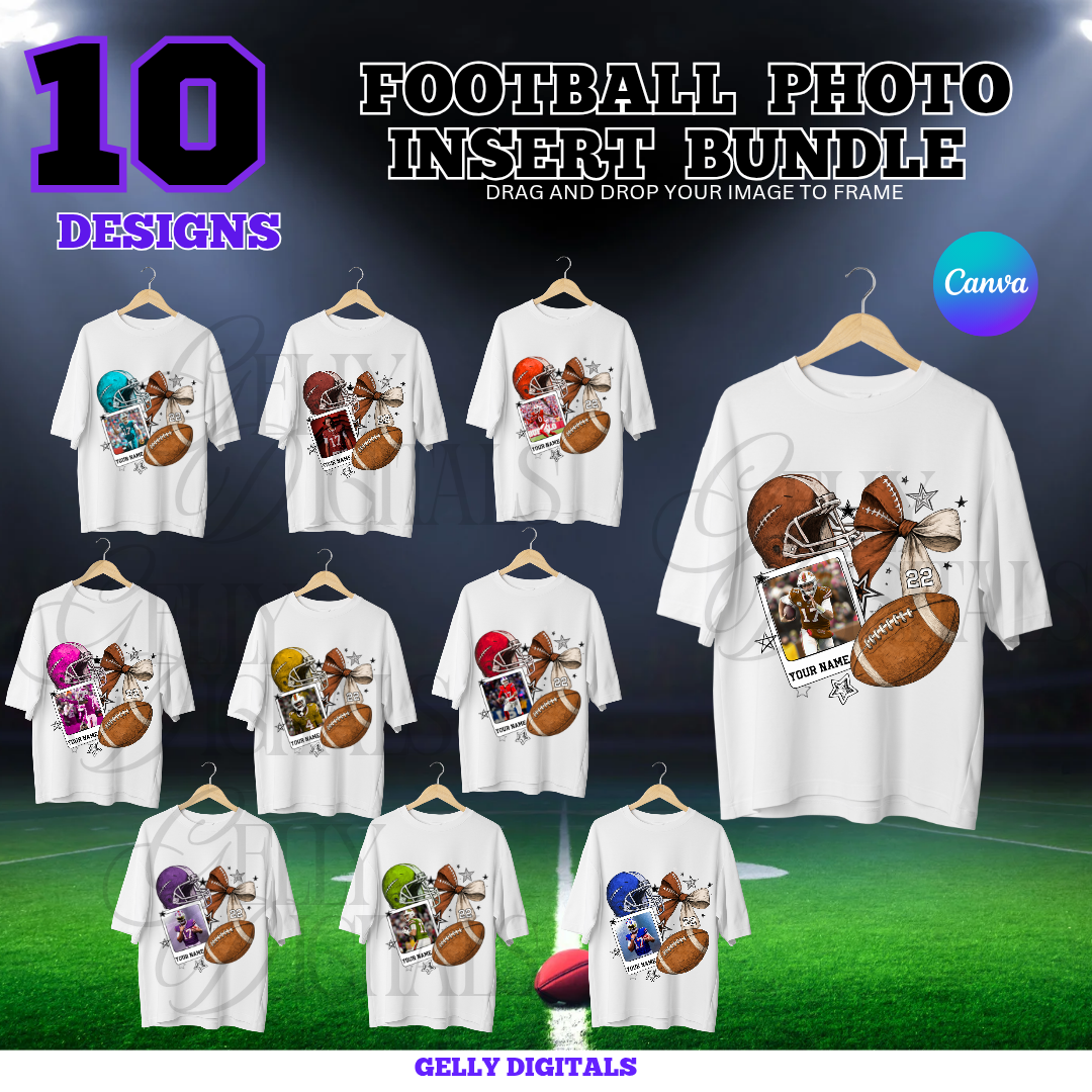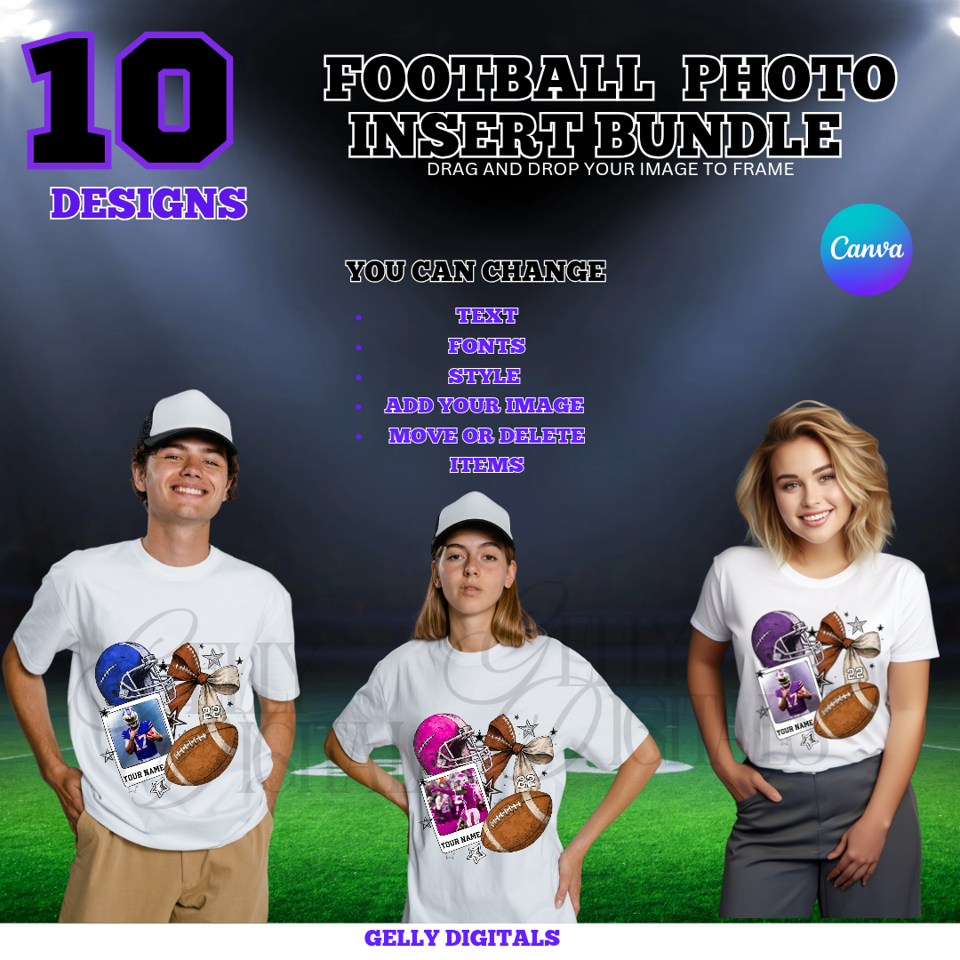 Show off your team spirit with this Football Photo Insert Bundle! Featuring 10 customizable Canva templates, you can easily drag and drop your own photos, change text, fonts, and colors, and make it completely your own. Perfect for football players, fans, and sports teams who want to stand out with personalized designs.
