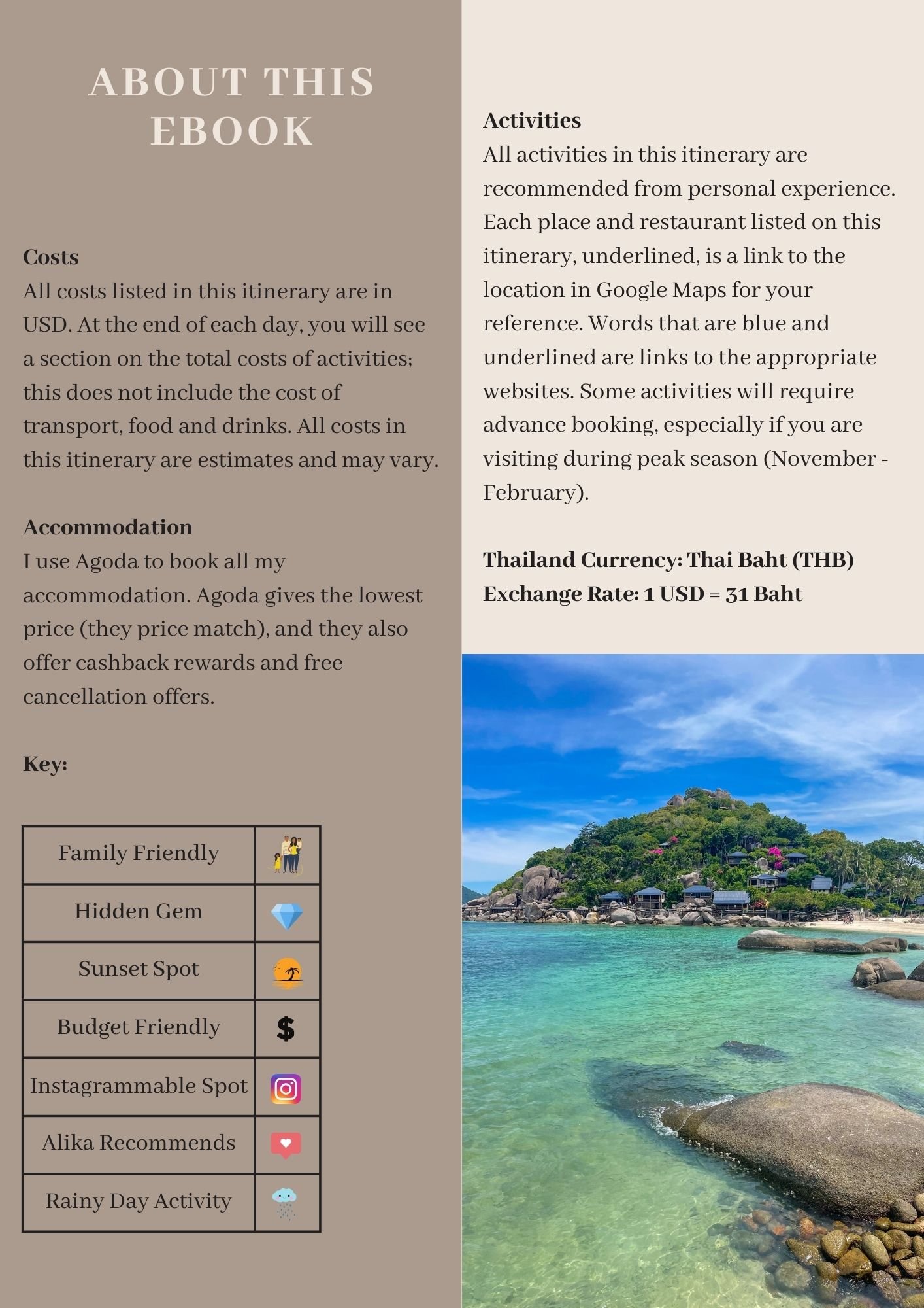 The day itineraries included in this Thailand Travel Guide ebook have been created to ensure that the activities are conveniently situated close to one another. Each page represents a day itinerary, allowing you to choose based on your individual preferences, whether you're seeking relaxation, adventure, or cultural experiences.