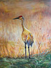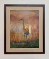 Medium: Oil pastel and Polychromos colored pencil on Canon Mi Tientes paper. 19"x25"; framed dimensions 25"x31". "Golden Hour Crane" is a study of stillness and quiet observation captures the graceful presence of a sandhill crane in the golden hour light of Northwest Indiana. Blending realism with impressionistic softness, the piece invites the viewer to pause and appreciate the fleeting beauty of nature.