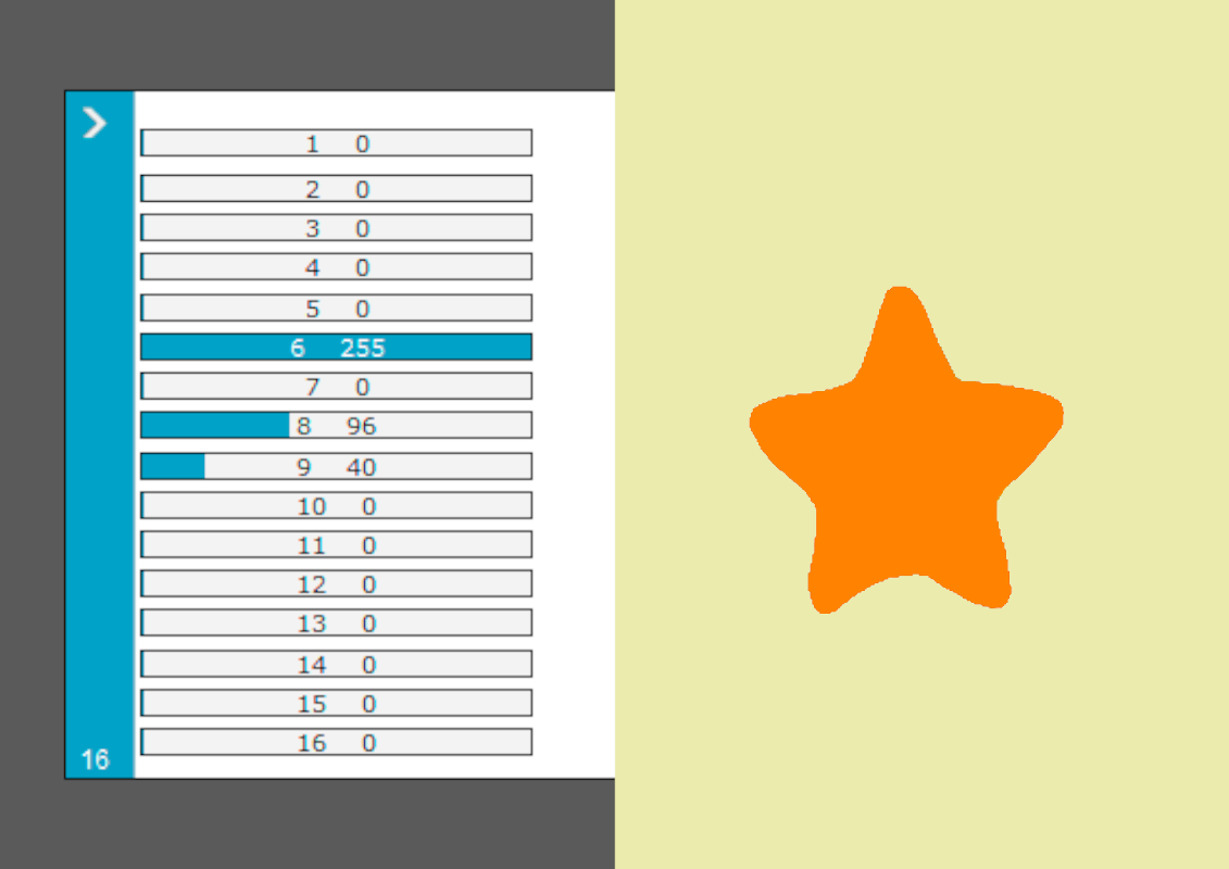 * Verifique, con un Fixture de pruebas (click), que coincidan estos canales: 6 Dimmer, 8 en el valor 96 = Color Naranja, 9 en el valor 40 = Gobo de la tercer foto.