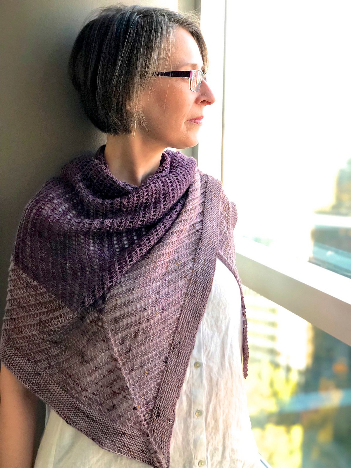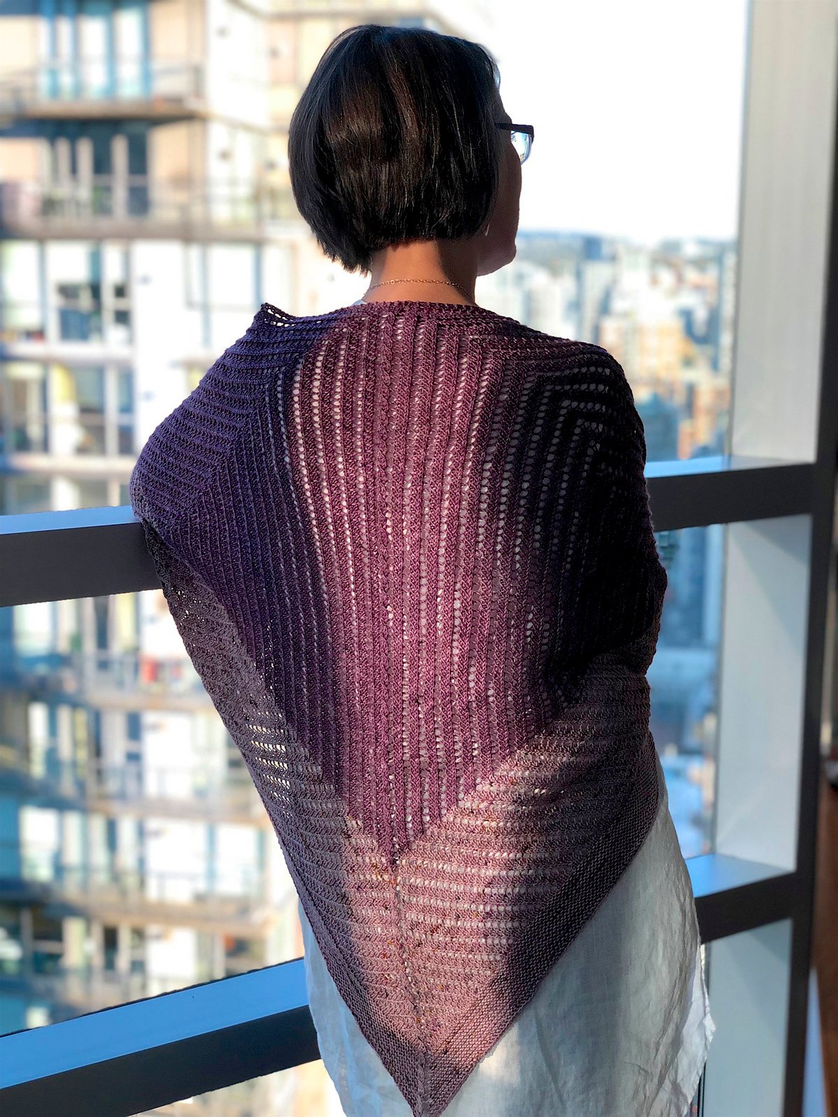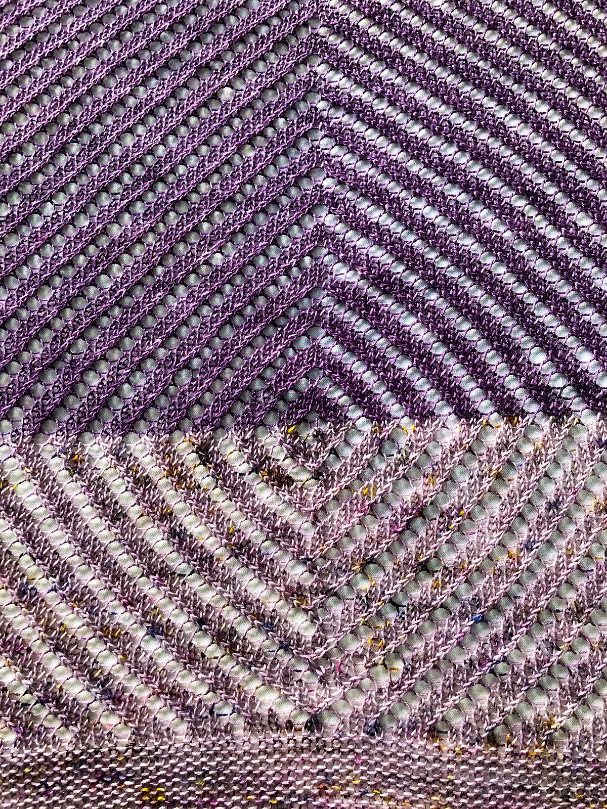 Simple rows of eyelets highlight the clean geometry of a triangular shawl – but changing direction at the same time as changing colour turns the triangles into nested squares, while forming a distinct border.