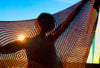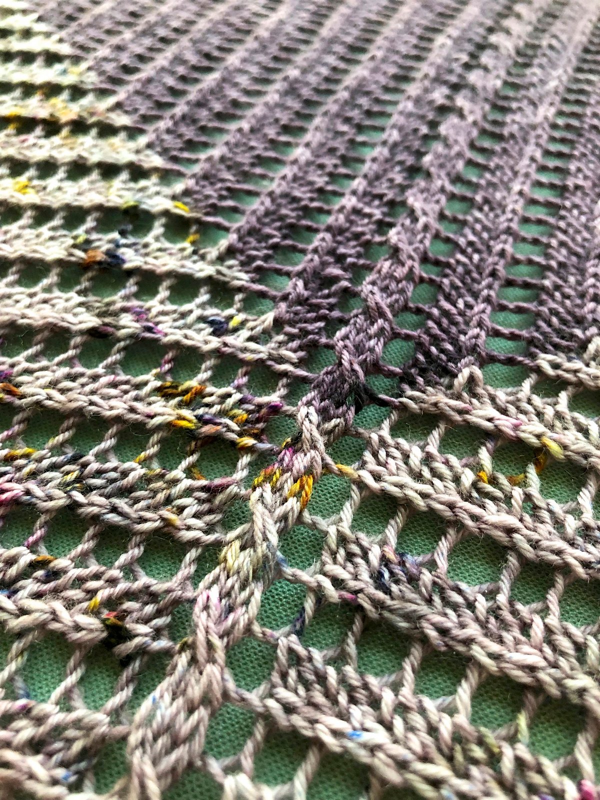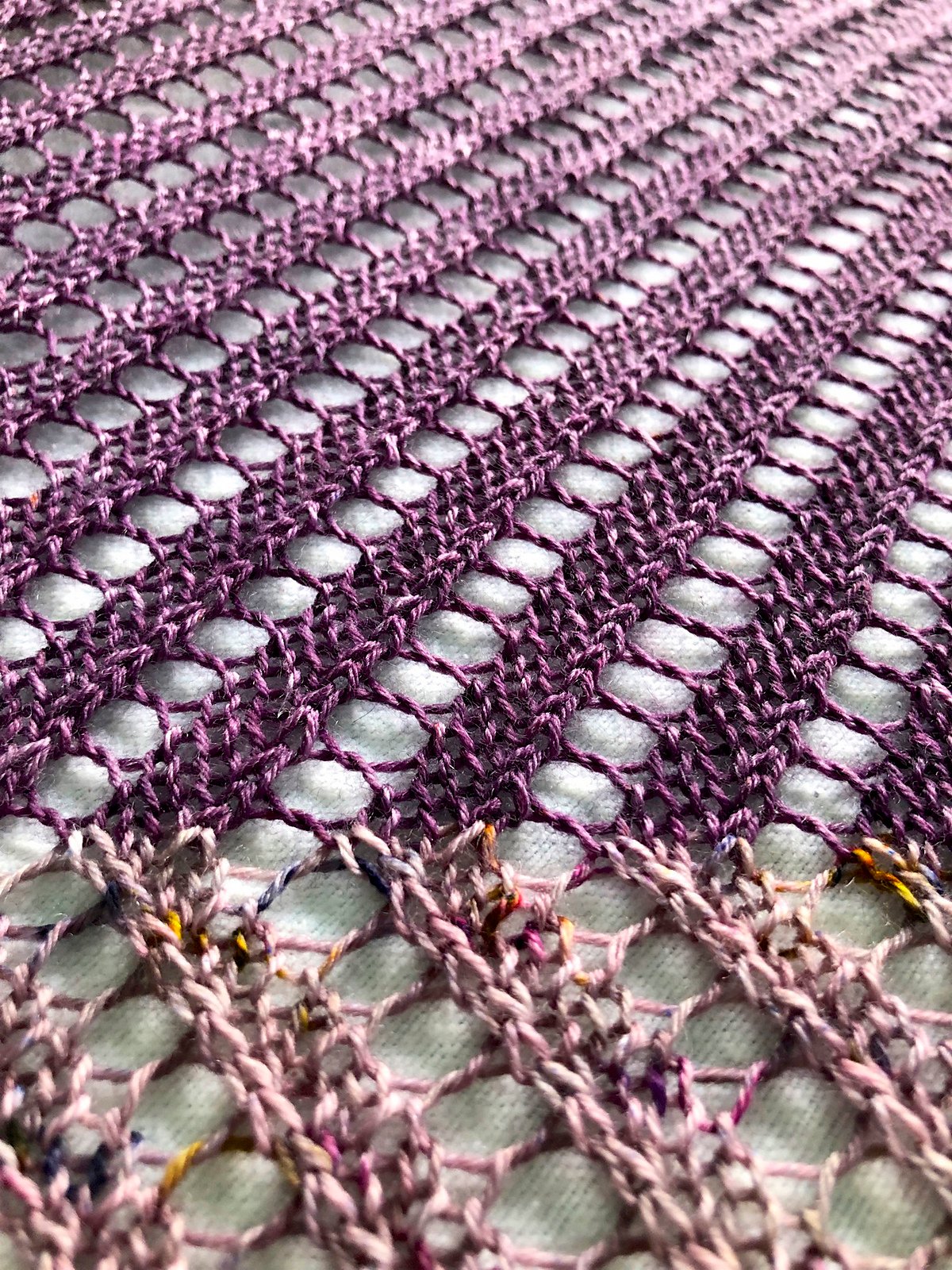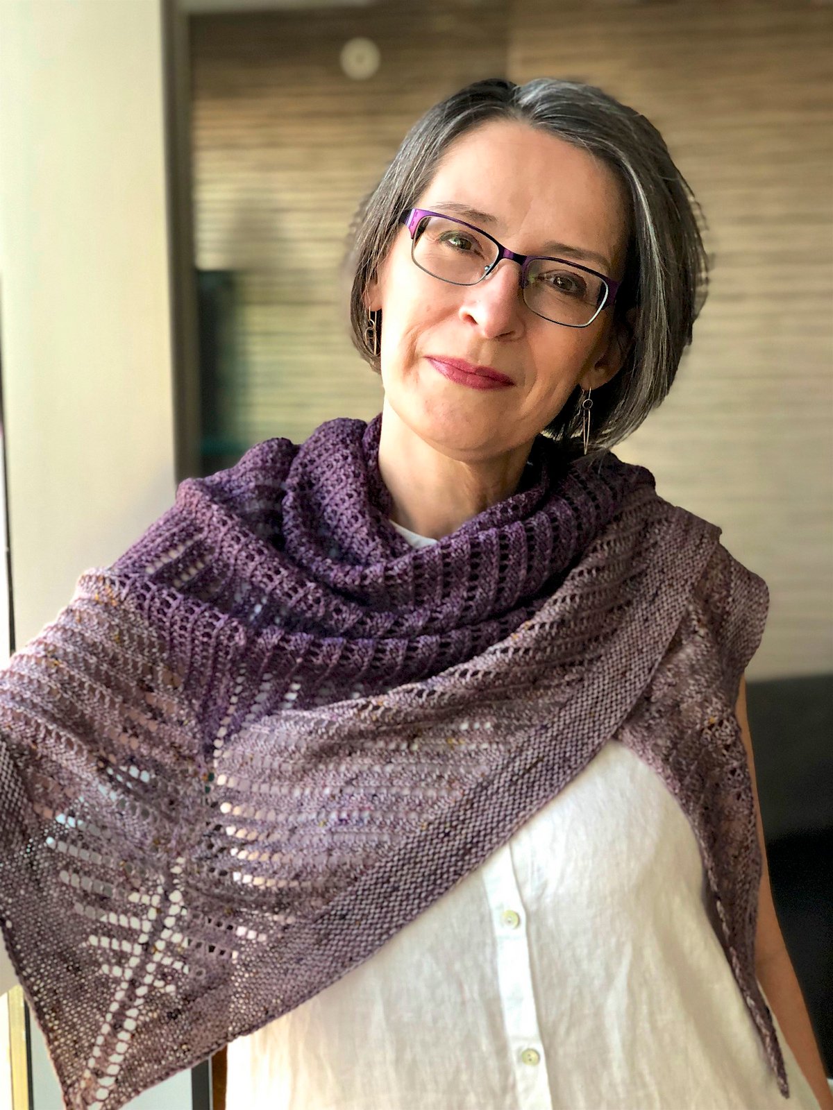 Simple rows of eyelets highlight the clean geometry of a triangular shawl – but changing direction at the same time as changing colour turns the triangles into nested squares, while forming a distinct border.