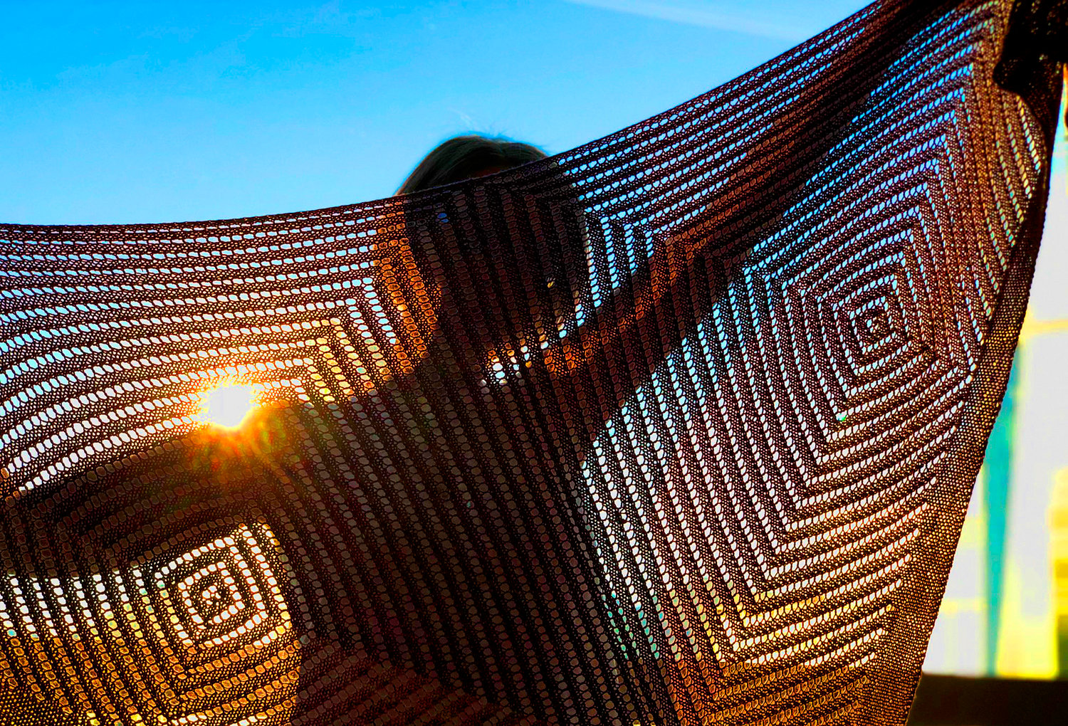 - 19.5 sts and 38 rows = 4” (10 cm) over lace pattern using 3.5 mm (US 4) needles, hard blocked