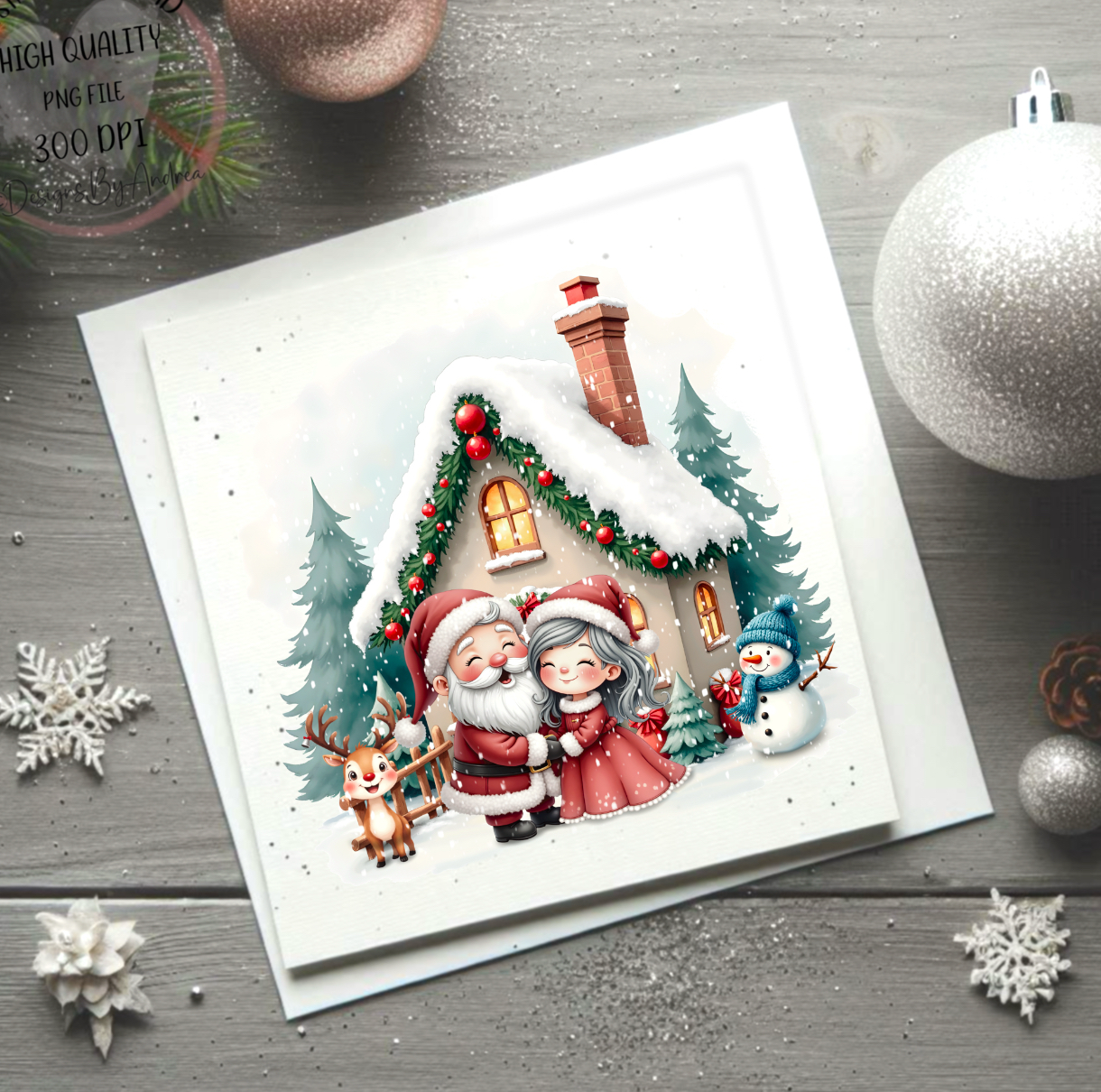 Santa and Mrs Claus Christmas scene, ideal for cards, t shirts, gift sacks, mugs and more!