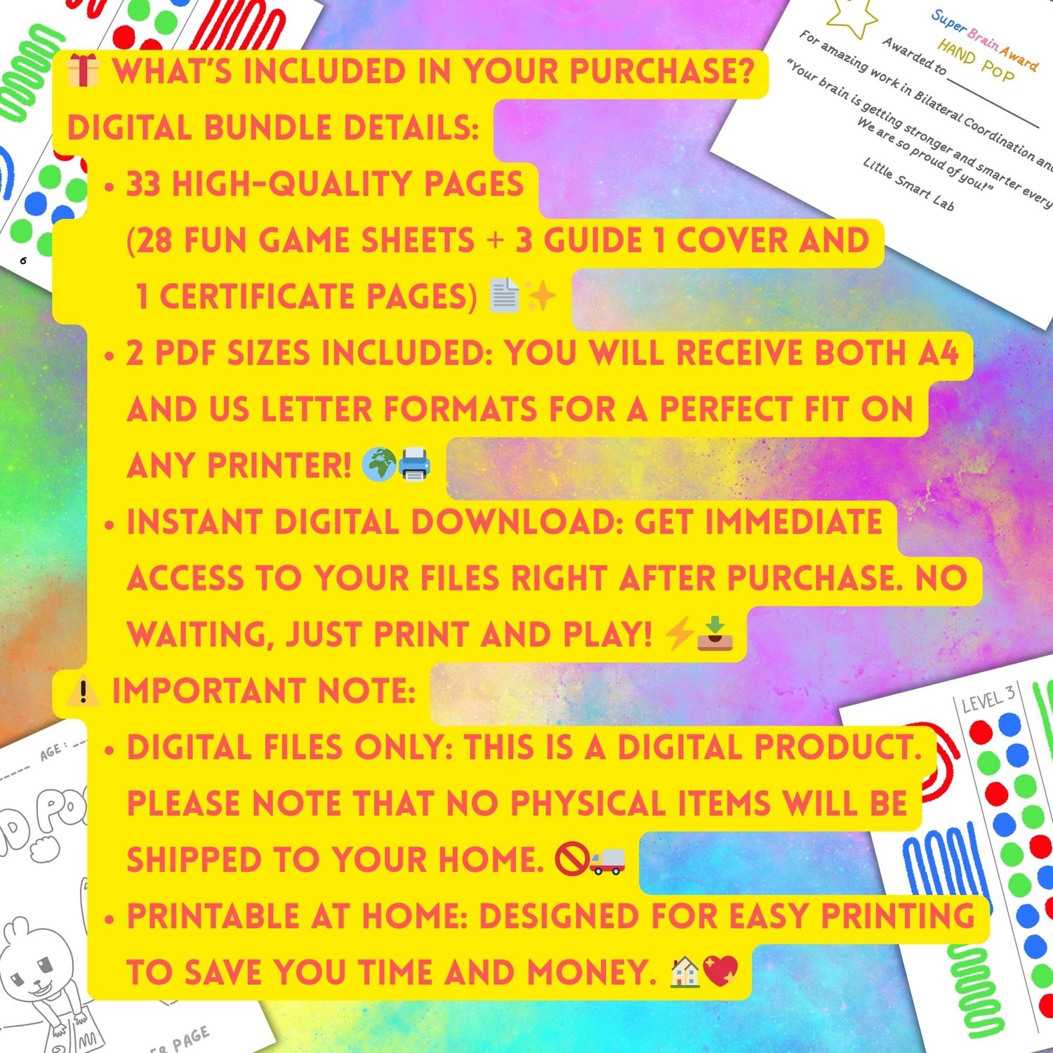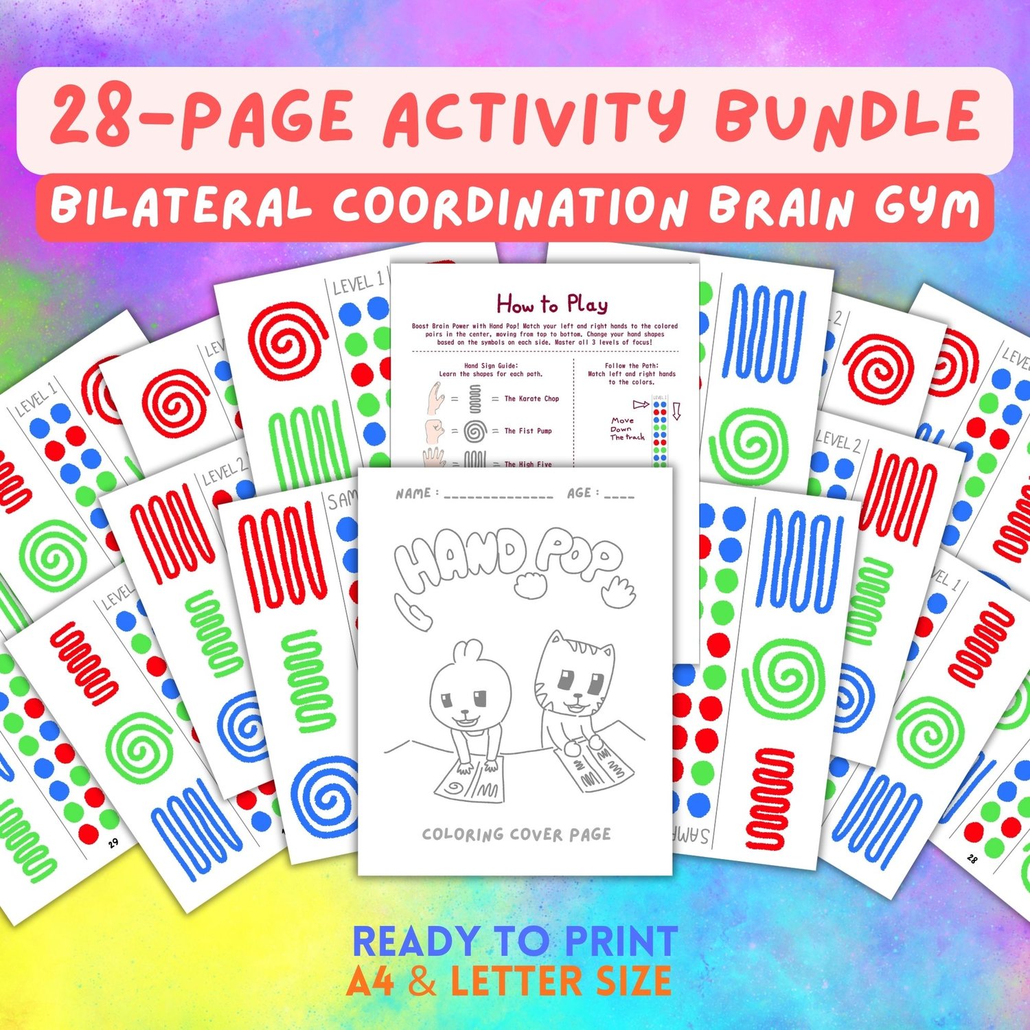 **What You'll Get:** 28 game sheets + 1 coloring cover + 1 cetificate page + 2 hand guide + 1 instructions. Commercial use OK for teachers/therapists.