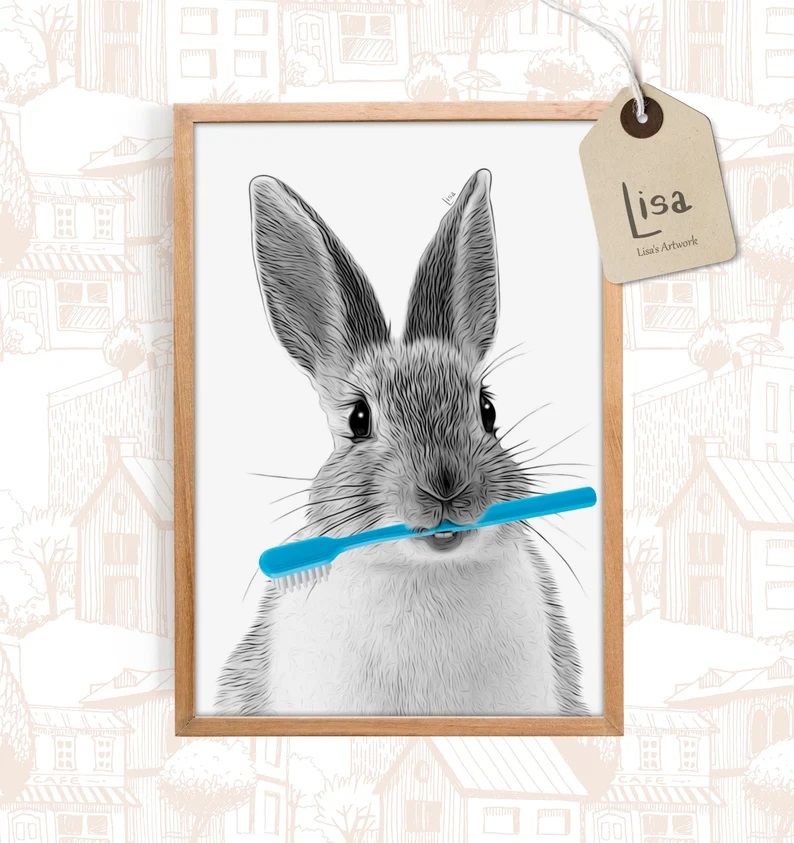 Bathroom art brushing teeth, bunny, rabbit, bathroom wall art, bathroom kids art, bathroom wall decor, toothbrush
